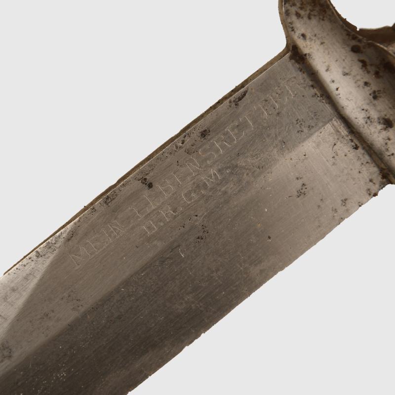 The very popular and hard to obtain in nice condition World War I trench knife produced by Anton Wingen Junior of Solingen, on the reverse side the etched title Mein Lebenstretter, which translates to” my lifesaver” blade generally good some cleaned corrosion to the tip, the steel cross guard nice condition with some black spotting, in its original leather scabbard with its buckle hilt closing strap, the securing point on the buckle is missing, the lower blade securing closure strap also complete with its fully functional male-female closure stud.