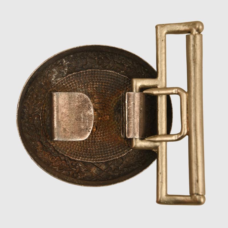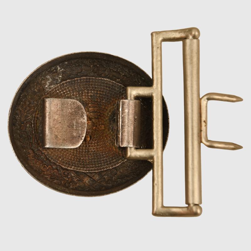 The oval belt buckle in white metal with gold early droop tailed eagle motifs to the centre, with its double pronged keeper. Generally used on the Luftwaffe officers brocade belt.
