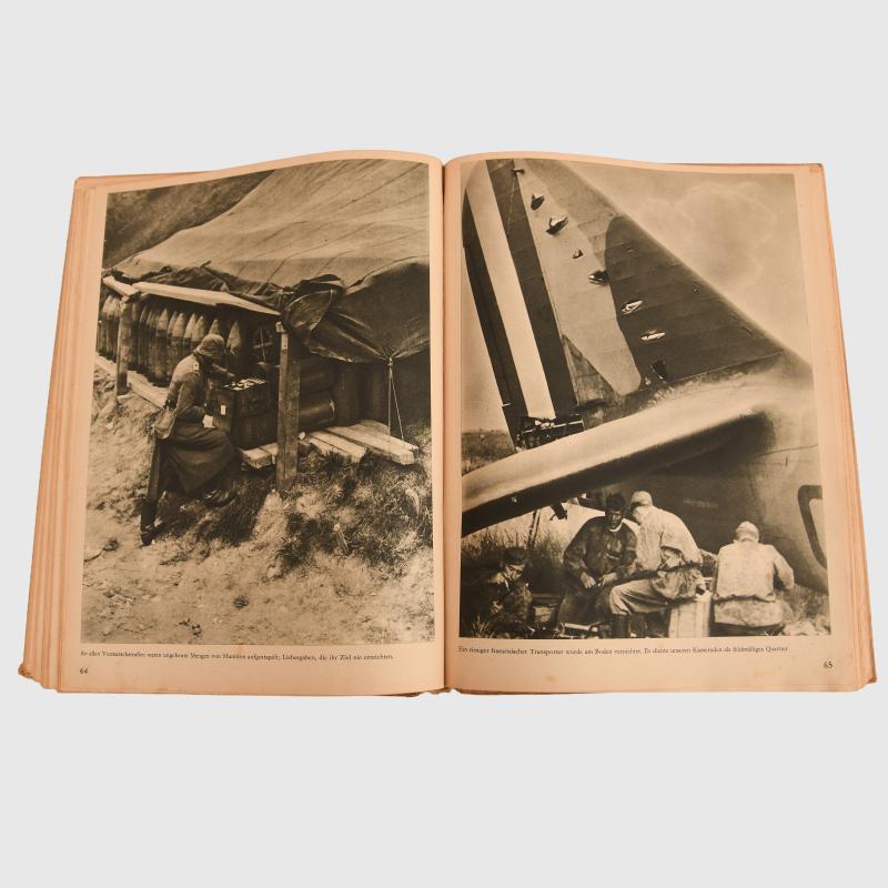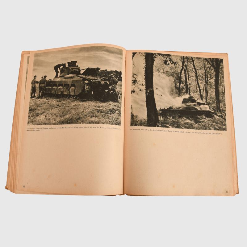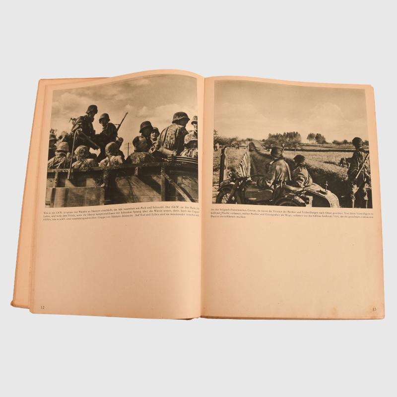 The scarce and desirable work Damals, comprising 118 pages full of black and white photographs of the Totenkopf Divisions actions in the French campaign, with accompanied text and annotations under the photographs. This highly interesting photographic insight into the uniforms, equipment and battles of the Totenkopf Division. On the last but one page a large picture of the Commander of the Division Theodore Eicke, to the front inside two covers an original owner has pasted two period photographs, one of Adolf Hitler another one of what appears to be a WWI trench scene. Some slight age foxing but generally very good condition, without its fly cover.