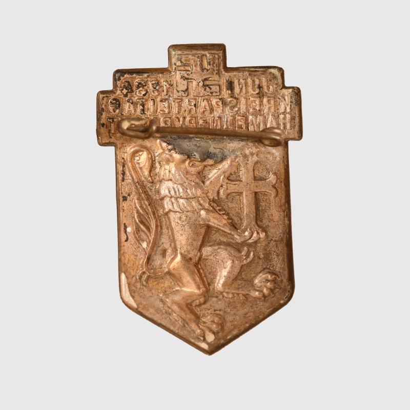 A nice tinny, lion rampant, surmounted by a swastika for a Party Day in Hameln Pymont 1934 with pin back suspension.
