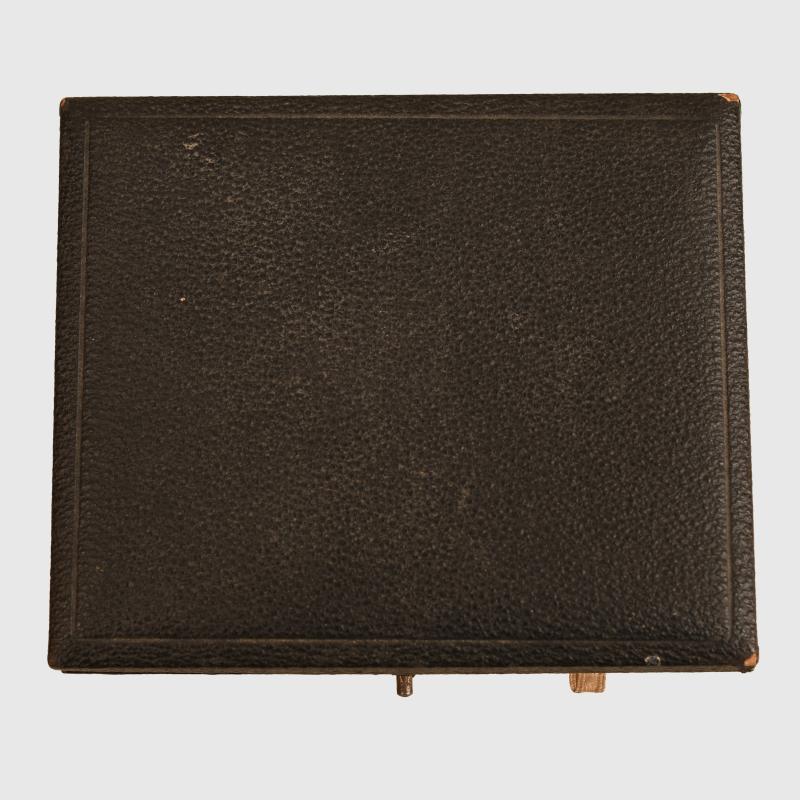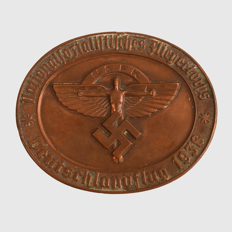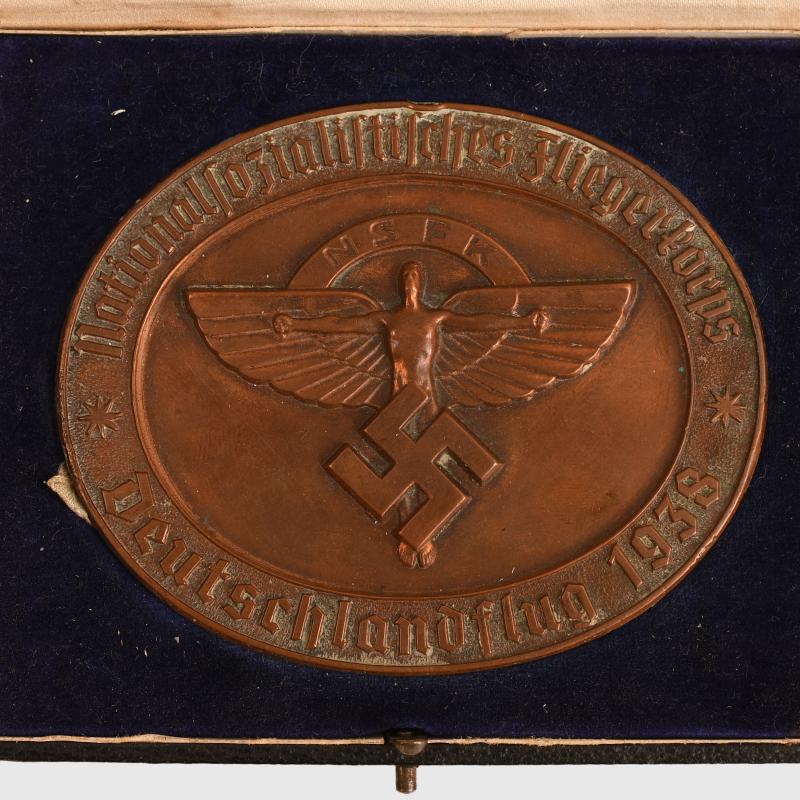 The bronze example numbered 6084 for the Around Germany Flying Race in 1938, in its original fitted case. One slight edge knock, oval shaped in its original veltvet silk lined case with the gilt blocked lettering to the upper inner lid National Sozialstisches Fliegerkorps Der Korpsfuhrer. Normally there is an award certificate placed in between the removable lid and the inner lid of the box, this award certificate, which is named is missing.