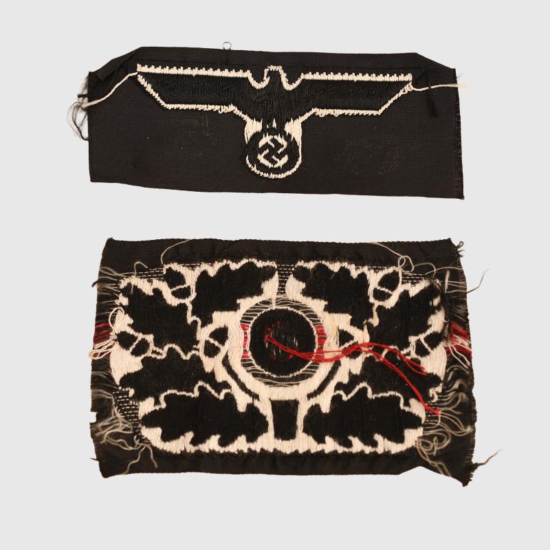 A rare set of insignia being the early white on black Bevo woven eagle and cockade. Both cut from roll, both identical in colour.