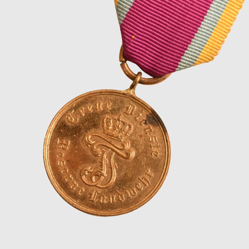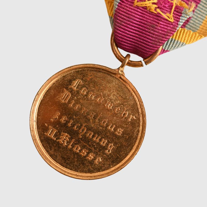 A very fine condition Landwehr Long Service Medal 2nd class for the State of Mecklenburg/Schwerin. All gilding remaining with its yellow, turquoise and purple ribbon. Scarce medal for this small State of Mecklenburg.