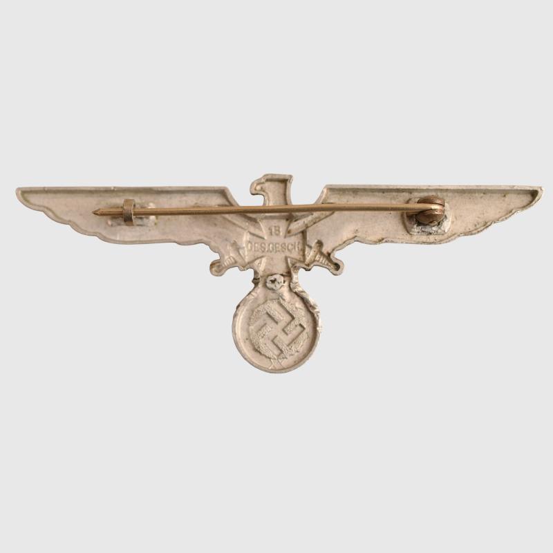 A very nice stamped aluminium breast eagle measuring 9.5cm in width with black enamel Iron Cross, which has had one abrasion. Complete with its pin hook and hinge to the reverse side.