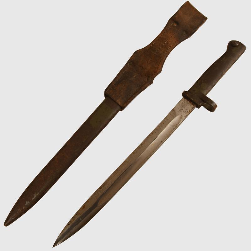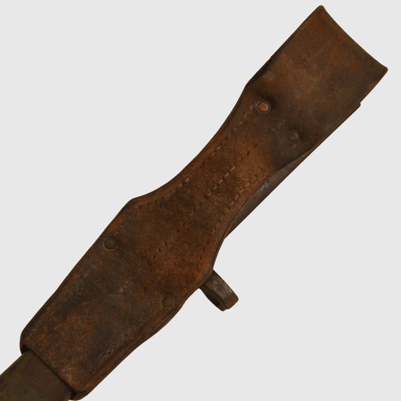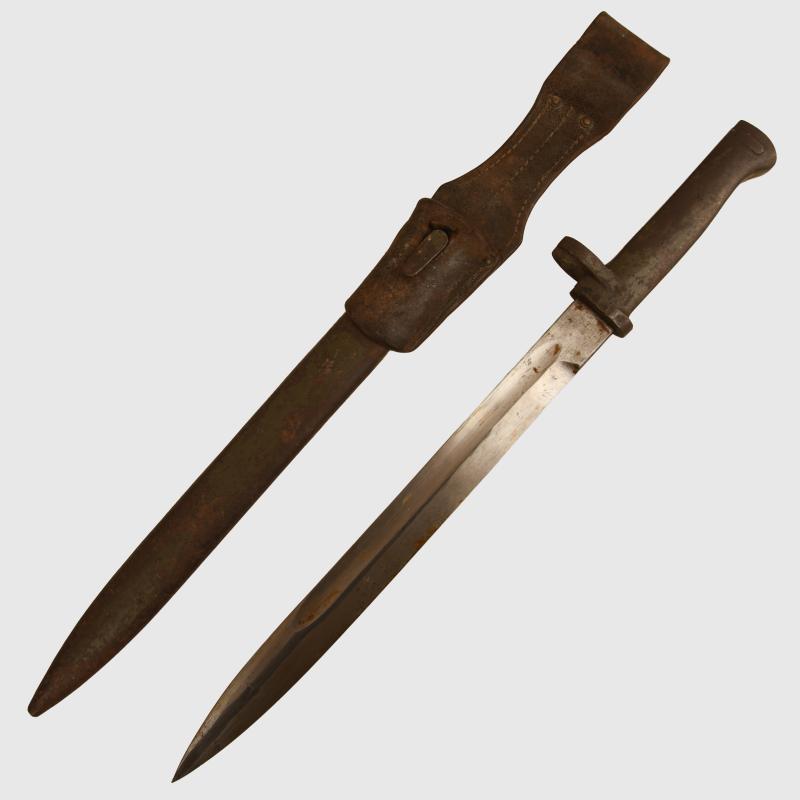 A very nice condition ersatz bayonet with at least 80% of its original field grey green paint finish remaining to the hilt and scabbard, with its original leather frog. The blade is excellent, not sharpened or reprofiled, with its Imperial German acceptance stamp on the flat back edge of the blade.