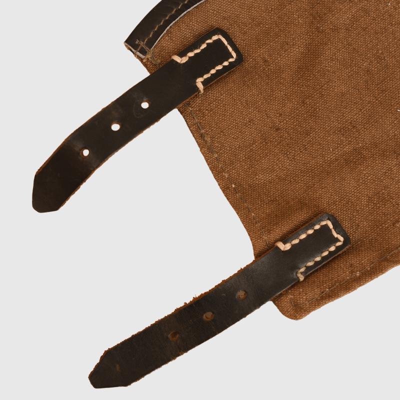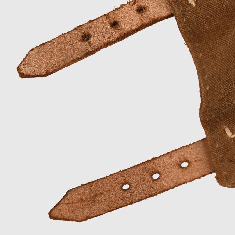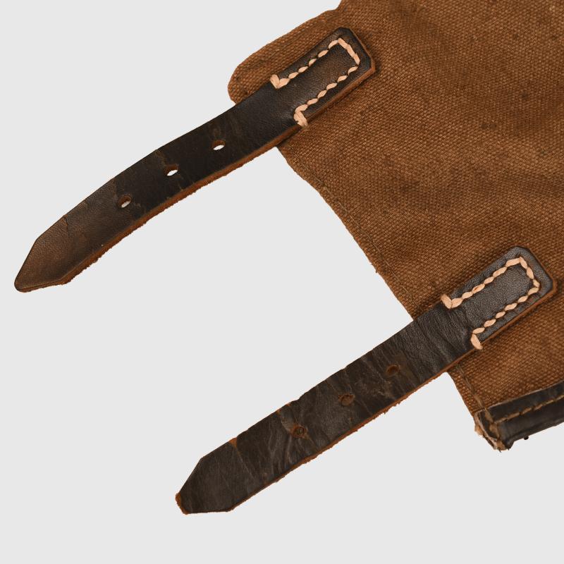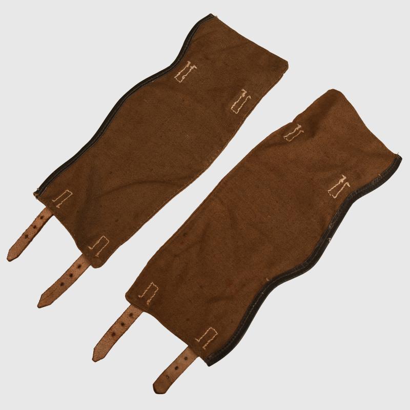 An absolutely mint pair of late war gaiters in a more earth brown colour than olive drab, complete with all of their black leather fittings. Good clean mint condition white stitching with a faint yellow maker’s stamping.