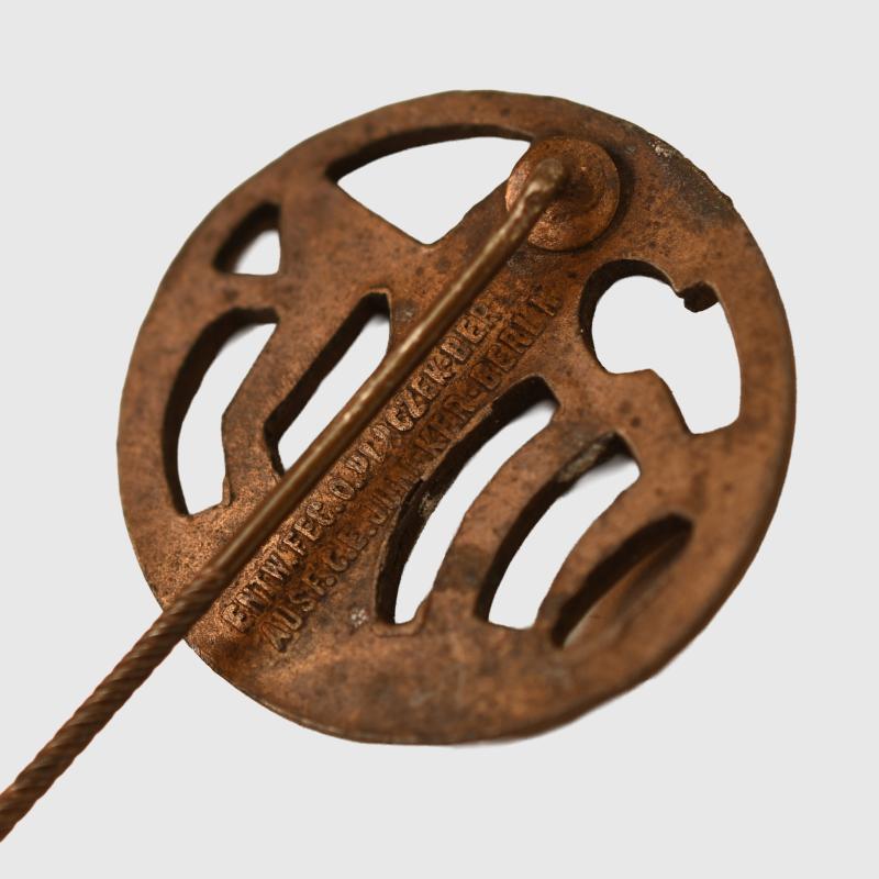 Lapel pin fixing. All bronze finish remaining but some loss of finish to the central stem below the eagle’s neck. A Berlin maker’s mark in raised relief on the reverse side. 20mm circumference.