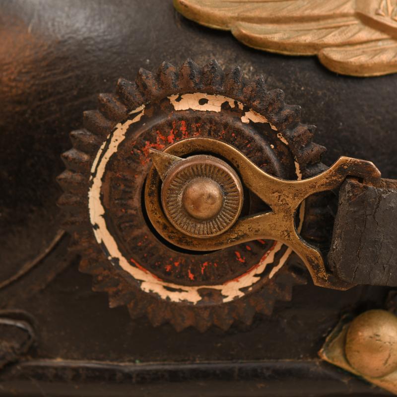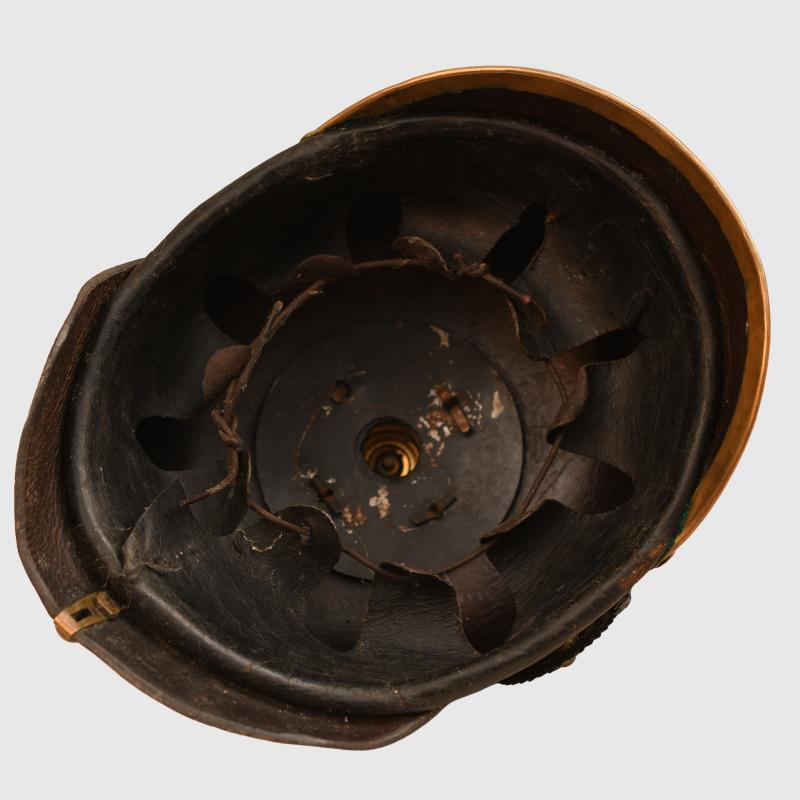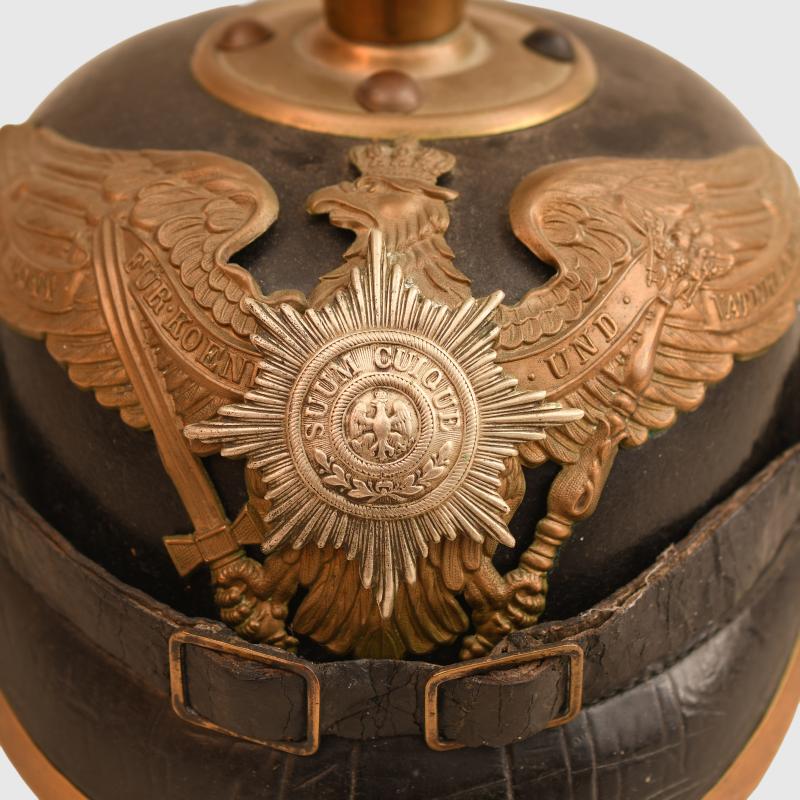 A good large size leather skull without any damage to skull, the front and back peaks firmly attached to the main body, all of the fittings in brass, which comprise backstrap, un-screwable spike and spike base, large front Guard plate, front trim, and strap fittings, all match in the same colour subdued brass, having its white metal Prussian guard overlay plate, original leather strap with brass buckles, the national cockade has lost majority of its paint finish, the Prussian black-and-white cockade matching condition but with more colour remaining, to the interior the nine tongued leather liner all complete, with its original drawstring. A nice quality larger size impressive size enlisted ranks Prussian guard helmet. More extensive, extra images can be seen on our new Premium website, type in regimentalsmilitaria.co.uk in to your web browser.