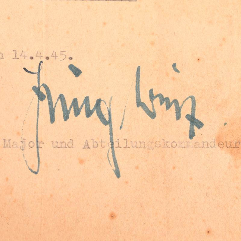 A rare field typed citation, A5 size, folded once and punch holed twice for filing to Fahnenjunker-Oberfeldwebel Albert Ebeling who served on the staff of Paratrooper Reconnaissance Unit 12. He was awarded the Close Combat Bar in bronze for 16 combat days dated ?14th April 1945?. Complete with rubber ink signature and pen signature of Unit Commander.