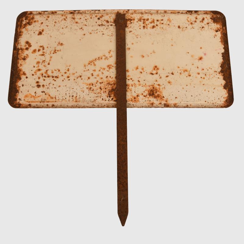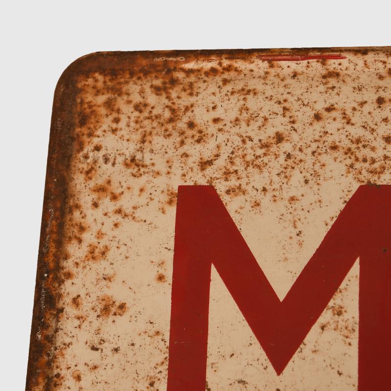 A slightly rusty white painted with red lettering road side sign placed by forward reconnaissance troops advancing ahead of the main forces and warning of the advancing troops of presence of mines. The sign measure 29cm x 65cm, with its original prop, one of the threaded screws and nuts holding the prop in place is missing. An interesting and historical signage from the advance of the British Army through Northern Europe in WWII.