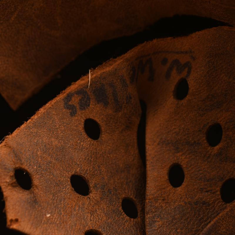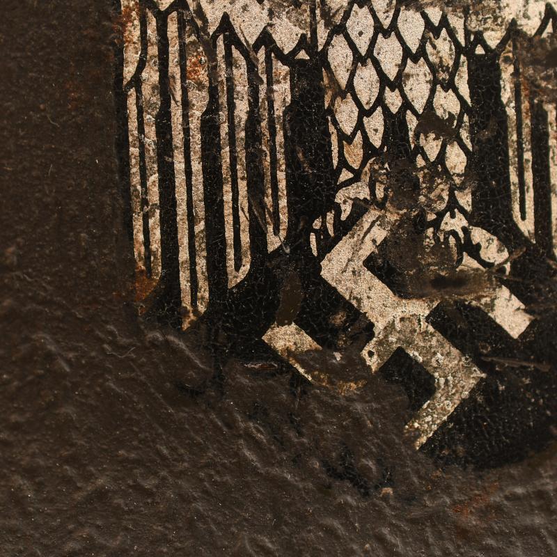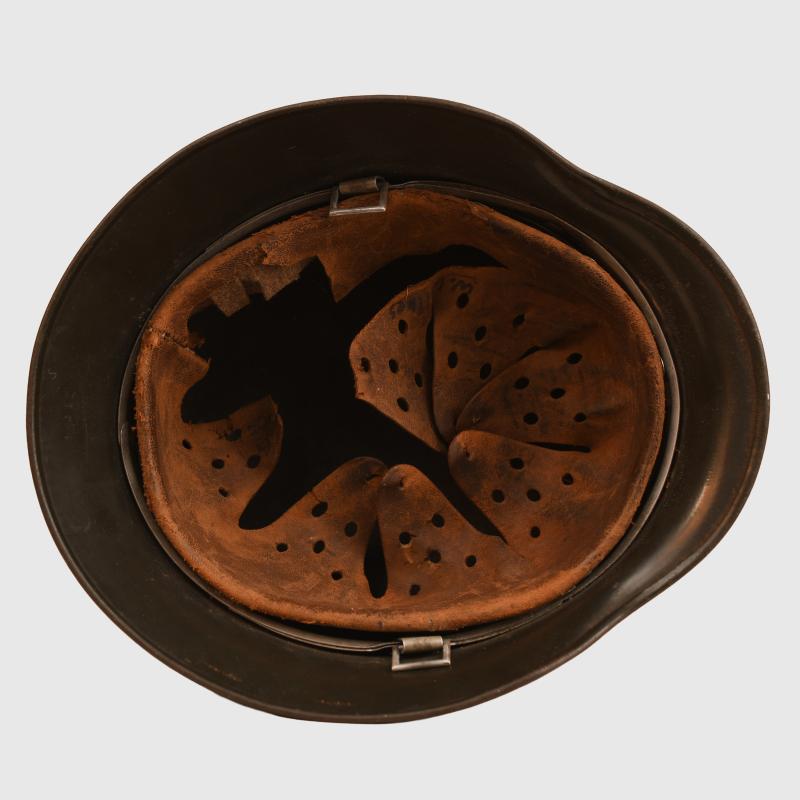 Originally a double decal M35, the helmet has been factory or depot refurbished with the removal of the tri colour decal, the outline of the tricolour can be seen also the paint over the years has congealed in a different way over the decal area than on the shell, the original army decal is nice and clear , the refurbished light wood chip finish has strayed slightly over the lower left hand arm of the Swastika, the remainder of the grey wood chip finish, virtually all complete, shell size EF66, batch number 21446, the M35 aluminium liner band all complete, strap missing, the liner itself has one tongue missing and a large tear below another tongue, one wearers name to the leather liner, Ink stamped 58.