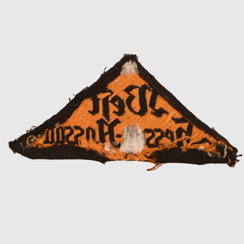 Bevo woven gold on black rather frayed edges with glue on the reverse side where once attached to a collectors display board.