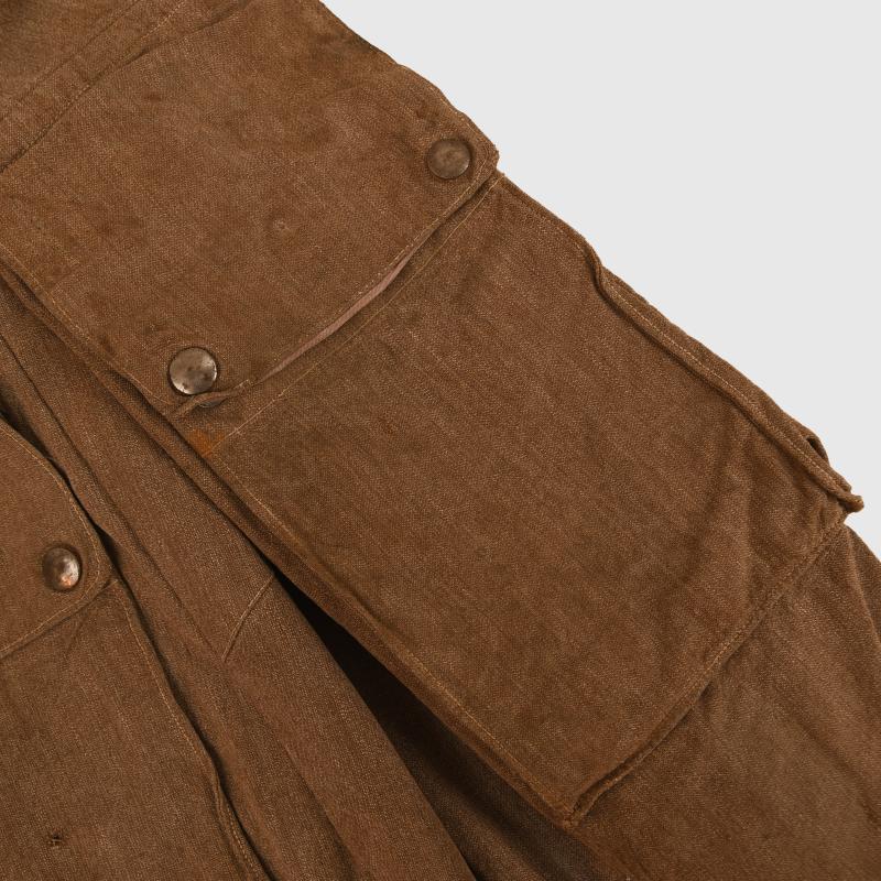 Out of all the Luftwaffe flying suits the two-piece summer weight unlined suit in the salt and pepper material is possibly one of the most difficult to obtain and of the two pieces of the suit the trousers are without doubt the rarest. This pair are a medium size pair, they have had the two hip zips removed with the openings re-stitched and the further two zips that run down the hips close to the knee have also been removed. The front crotch zip is of the plastic variety. The two front pockets are complete with their male/female closure system. The exterior closure flap for the angled right hip flare pistol pocket is all intact. The inner bellows of the pocket have been removed. Both lower leg nickel zips are all complete and have their zip runners intact, but the section which attaches to the pullers is broken away on both. Other minor nicks and minor repairs but no undue staining and are ideal for display with an appropriate flying jacket.