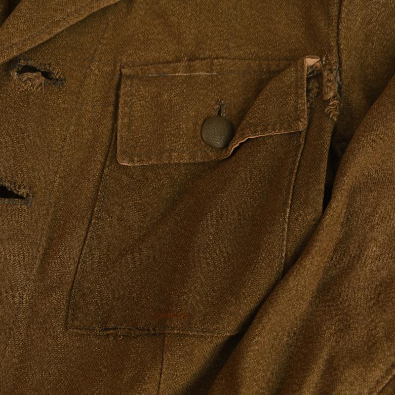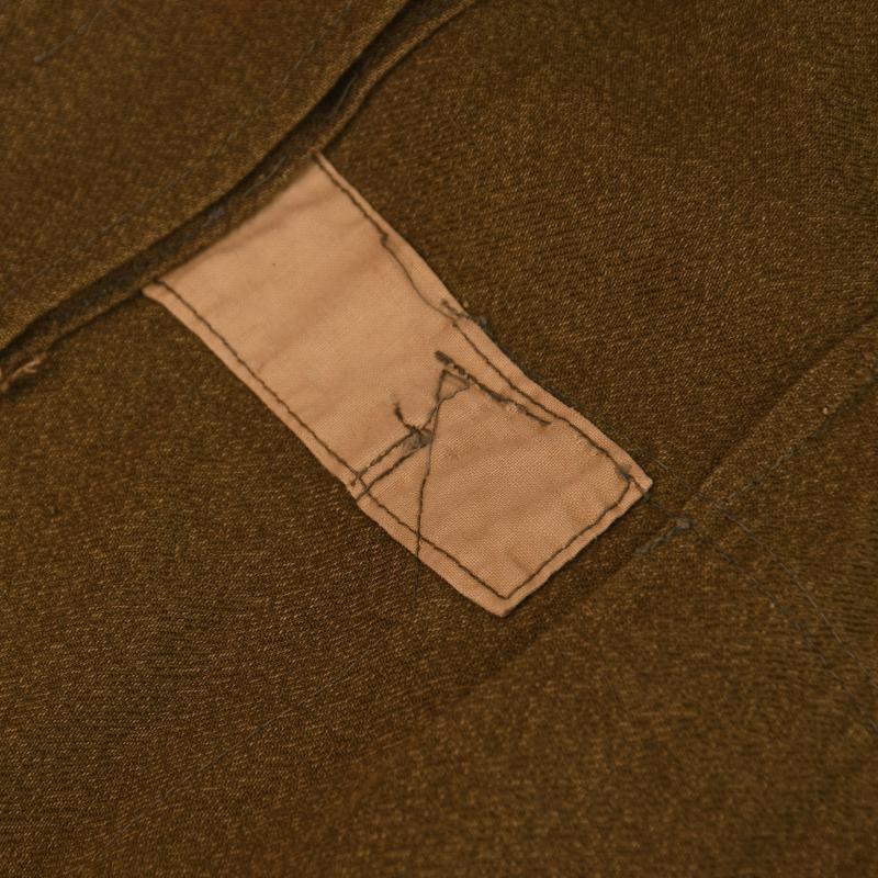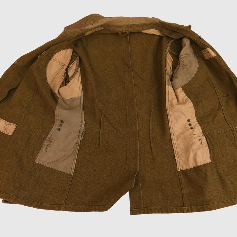 An unusual material used in the construction of this tunic, classic tropical olive drab colour but with a speckle in the construction reminiscent of late war materials. Very faint traces of a makers mark and size stampings to the inner flap of the tunic. All removable buttons. Considerable wear to the very back of the collar, which has been repaired either period or by a collector, with its original tropical tan on blue enlisted ranks collar patches. A nice condition 1st pattern blue tan on brown tropical breast eagle. Loops for shoulder boards being of non standard material, no shoulder board buttons fitted. Standard four pocket configuration without pleats, which is correct for the later pattern tropical tunic. Six button closure. Skeleton lined to the interior. Standard adjustable cuffs with paper buttons. To the left hand sleeve as the tunic is viewed the seam underneath the armpit has come adrift and has been contemporarily repaired.