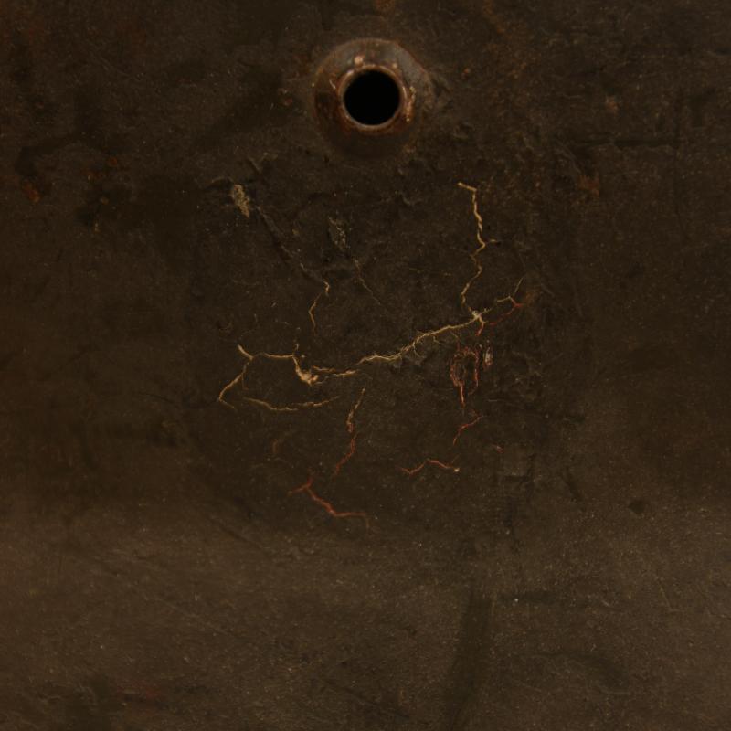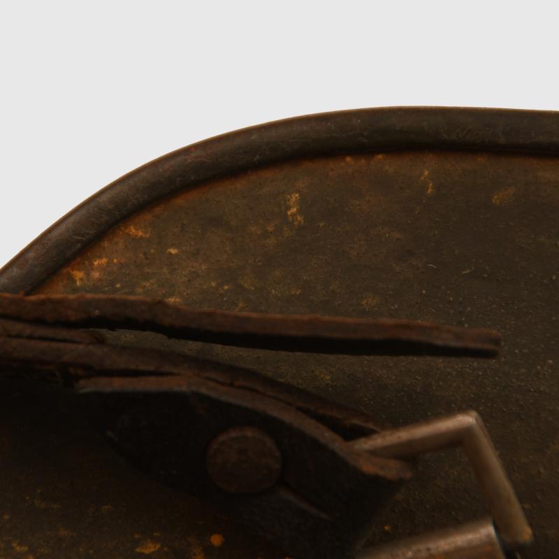 A nice condition liner size ‘55’ M.35 double decal combat helmet that under the 1940 regulations has been over-painted and hidden the national tricolour. Over the years the paint has cracked over the transfer and the colours can clearly be seen below. The army decal is good and clear. Some minor paint losses but a good 1940 addition over the early apple green. The paint has virtually removed itself from the three liner retaining studs. To the interior the size 55 liner all complete, good and supple but with evidence of much storage and a certain amount of wear use, with its original drawstring, its standard aluminium liner band and its chinstrap, which is all complete but dry. The shell size obscured by the 1940 overpaint.