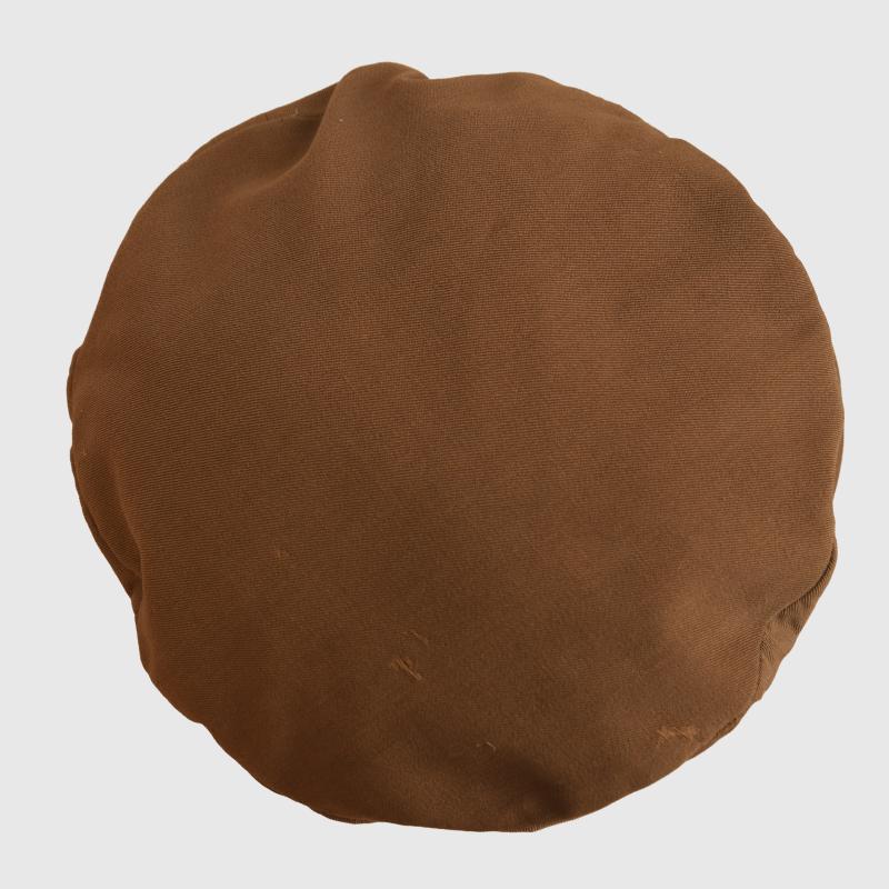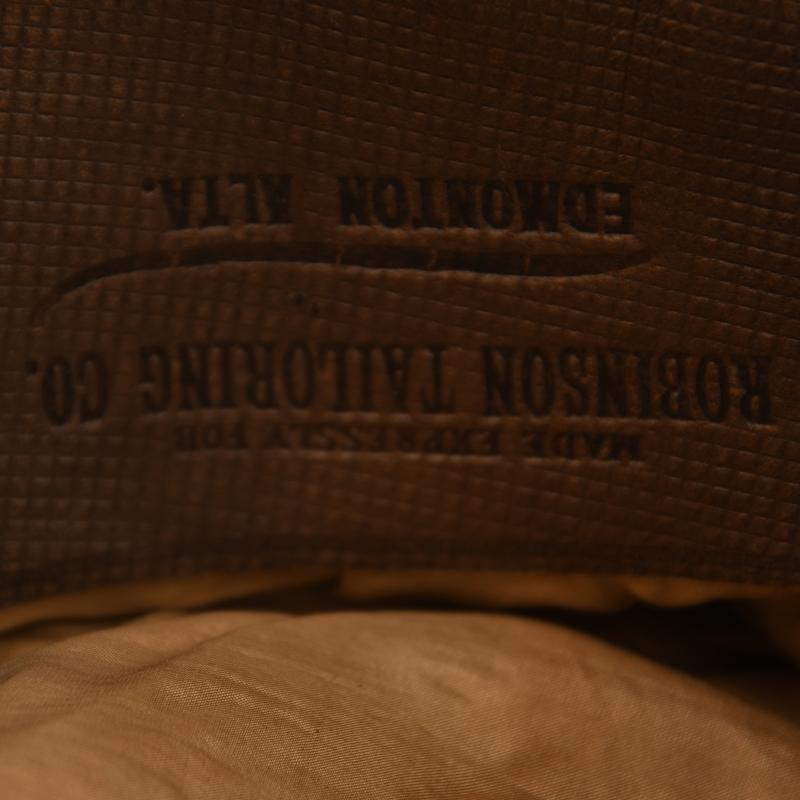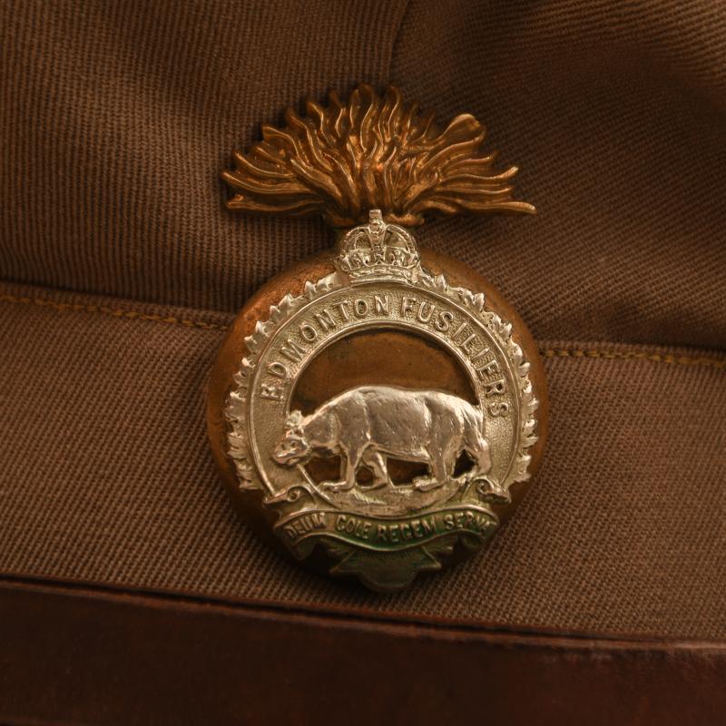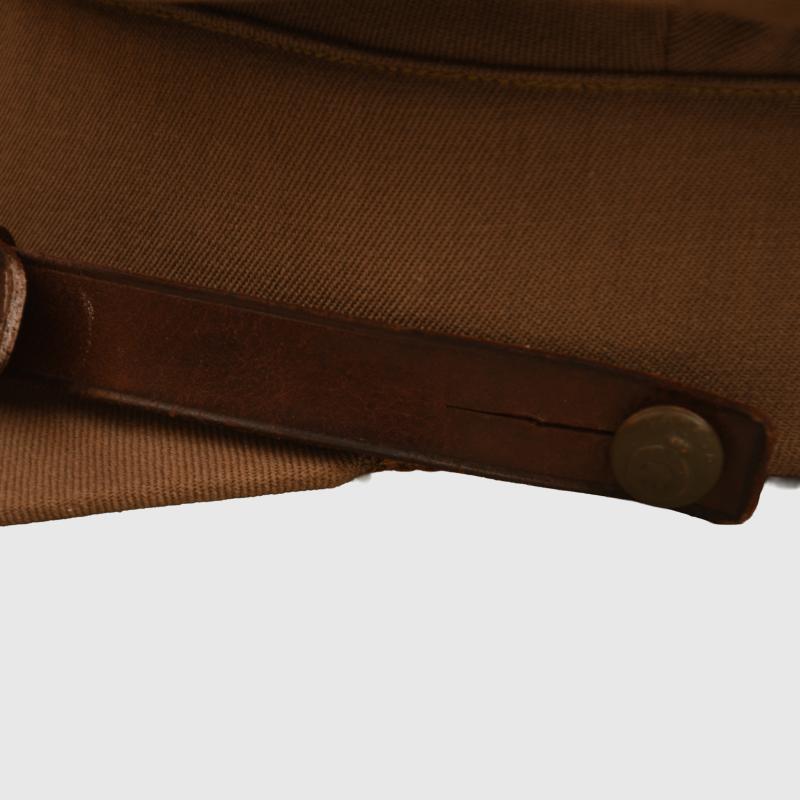 A World War I style cap In light beige colour, produced World War I and worn later with the wider World War II style chinstrap, good trench flopy style fitted with the 1929 badge of the Dominion Fusiliers, maker or retailer stamped into the cross hatched leather sweatband, ”The Muir brand”.