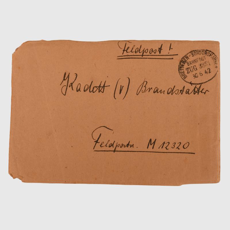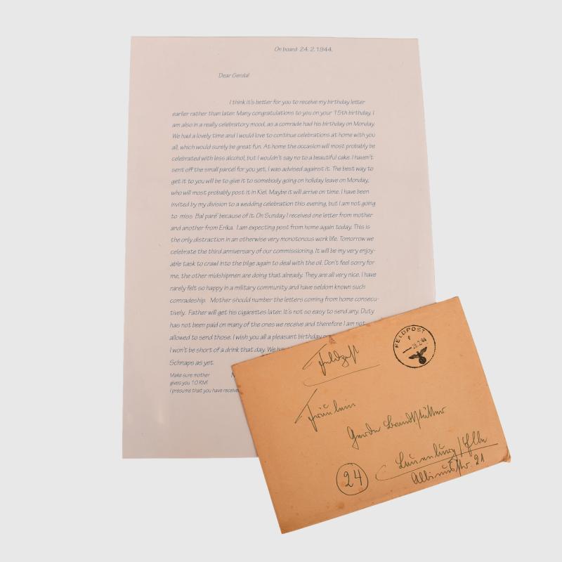 10 letters from Midshipman Berthold Brandstatter, field post number N30162 Battleship Tirpitz. All letters to his parents, which have been expertly translated and have a wonderful insight into the life of a sailor on one of the major German ships of WWII. Accompanied by many photographs of both the Tirpitz itself and his colleagues. A printed onboard programme of events on possibly a training ship in October 1941. Approximately 50 photographs. Also accompanied by a section of the wooden Tirpitz decking that was recovered from the Tirpitz by a David Hodgson, who acquired a large salvage section along with their flag and possibly some other parts of the ship from Jens Kristiansen, a retired policeman from Alta in the 1990’s, some of the deck still on display at Thorpe Camp. Thorpe Camp Preservation Group formed in 1993 to preserve the huts that remained of the former RAF Woodhall Spa, Woodhall Spa was the base in which RAF 617 Squadron flew to deliver the tallboy bombs, which sank the battleship Tirpitz.