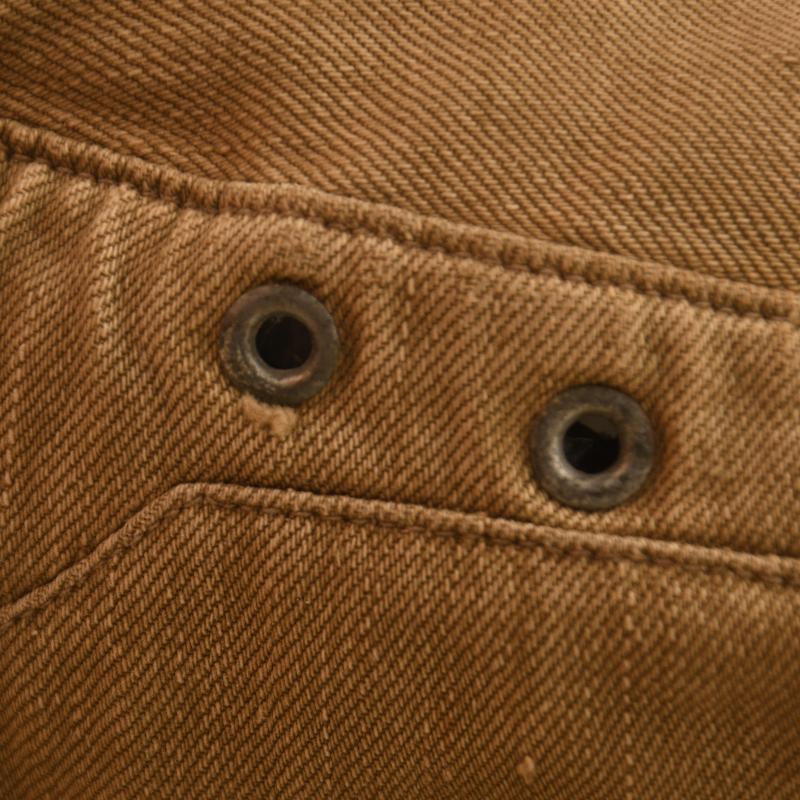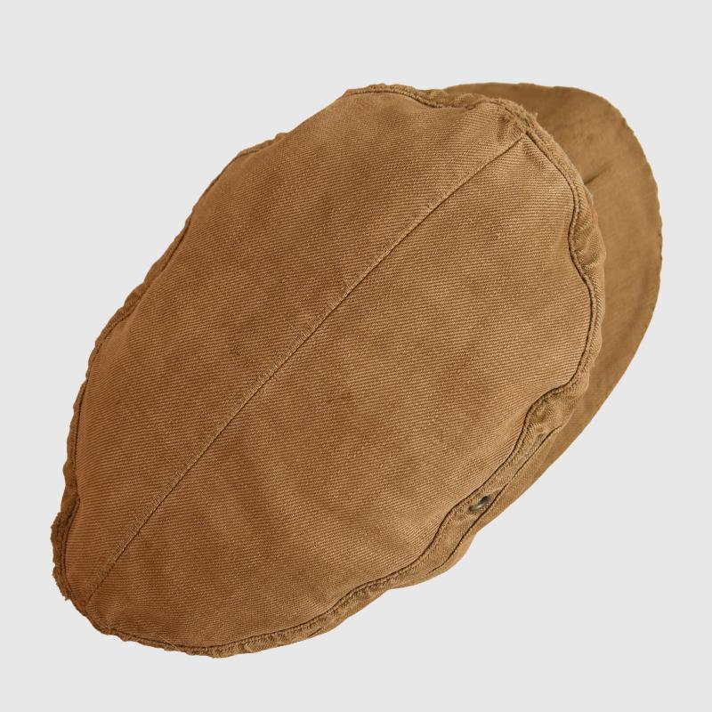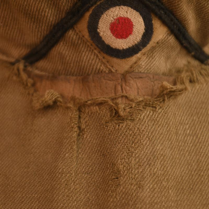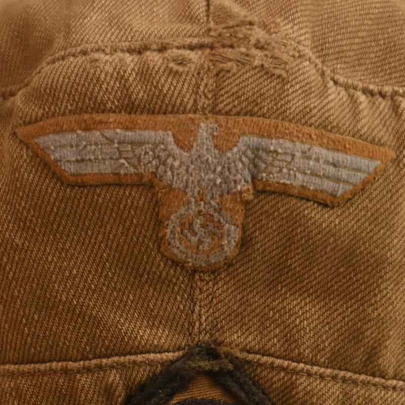 A well service worn example of the classic Afrikakorps enlisted mans visored field cap. Although not size stamped, possibly size 54 or 55. Faint traces of maker’s stampings to the inner red lining but not visible enough to decipher the maker or the actual size. To the exterior there is slight bleaching, the hat is complete with its untouched Bevo woven light tan on blue eagle and matching correct pattern cockade with the black pioneer inverted V waffenfarbe. Much shredding and degrading to the cap at the very rear upper point of the main body, the rear lower bottom edge of front peak trim and severe shredding in the area where the material covering the peak butts up against the main body of the cap, the cardboard former for the peak is visible at this point. Complete with both its correct zinc eyelets on both sides of the cap. A rare example of the pioneer worn Afrika Korps field cap.