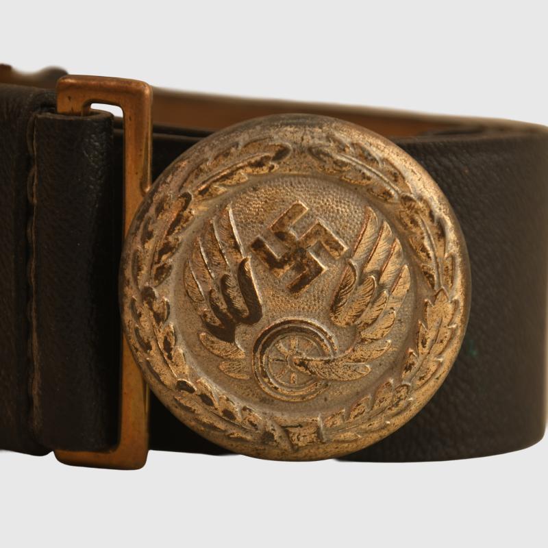 An excellent condition huge size 120 cm Bahnschutz officers all gilded circular buckle with the winged wheel insignia to the centre. Excellent gilt remaining, deeply toned to the interior and non maker marked, complete with its matching keeper. All fitted to a virtually mint condition pebbled leather belt. To the interior the belt is virtually white with a size of ‘120’ stamped. The belt is complete with both of its exact matching original pebbled leather sliders.