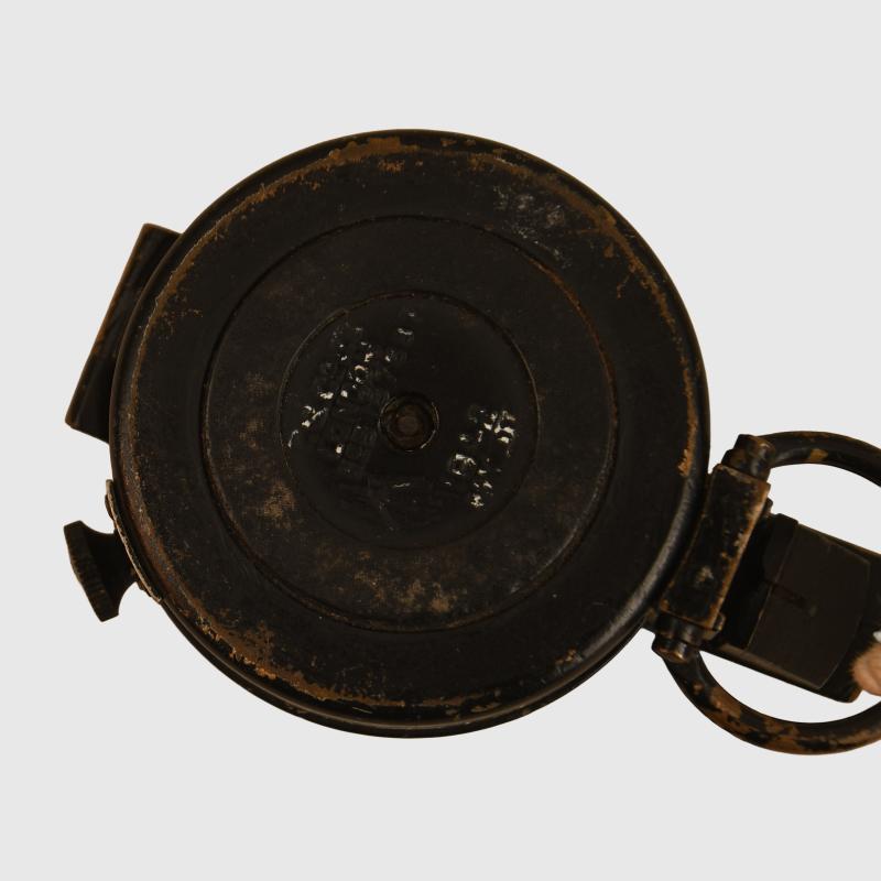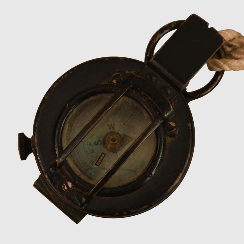 A very nice condition 1942 dated marching compass London maker marked, various issue numbers and broad arrow mark, the compass is fully functioning with all of its water complete with its scarce white rope lanyard.