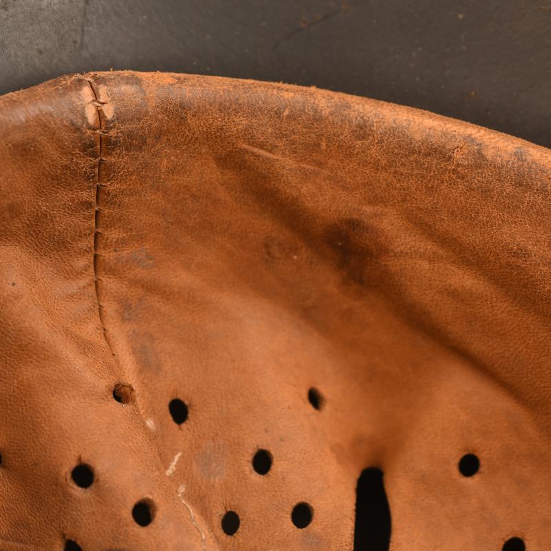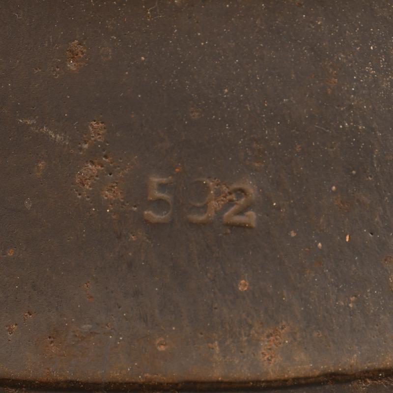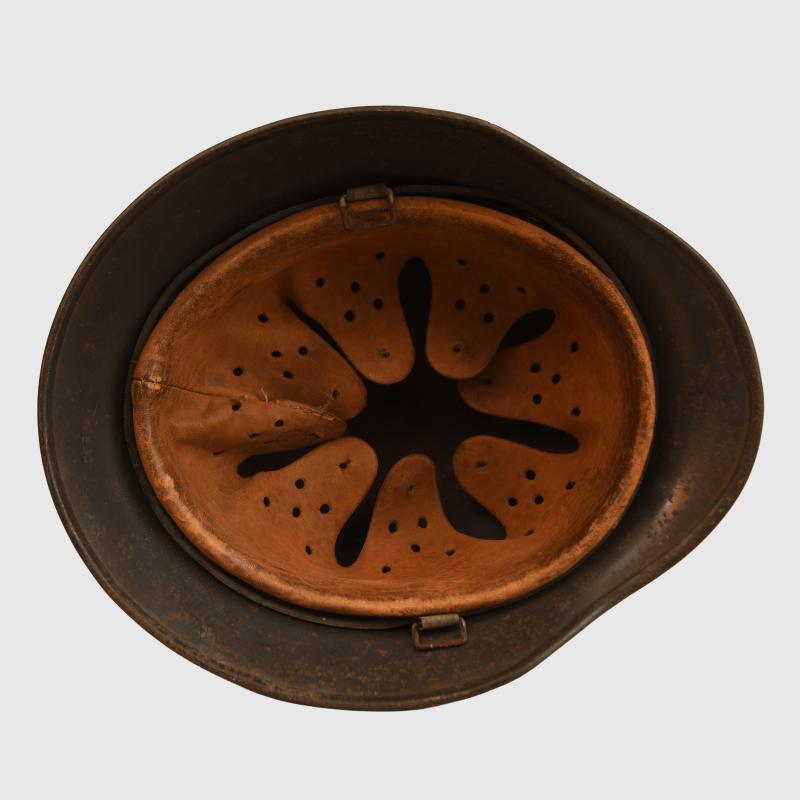 A Q64 manufactured shell, that has faint traces of a camouflage over paint which has at some stage been removed, when originally camouflaged the Luftwaffe eagle was left intact to be viewed in a triangular form. To the interior the size 56 light tan leather liner in generally clean condition all tongues present, liner band is the M 40 zinc type, chinstrap missing.