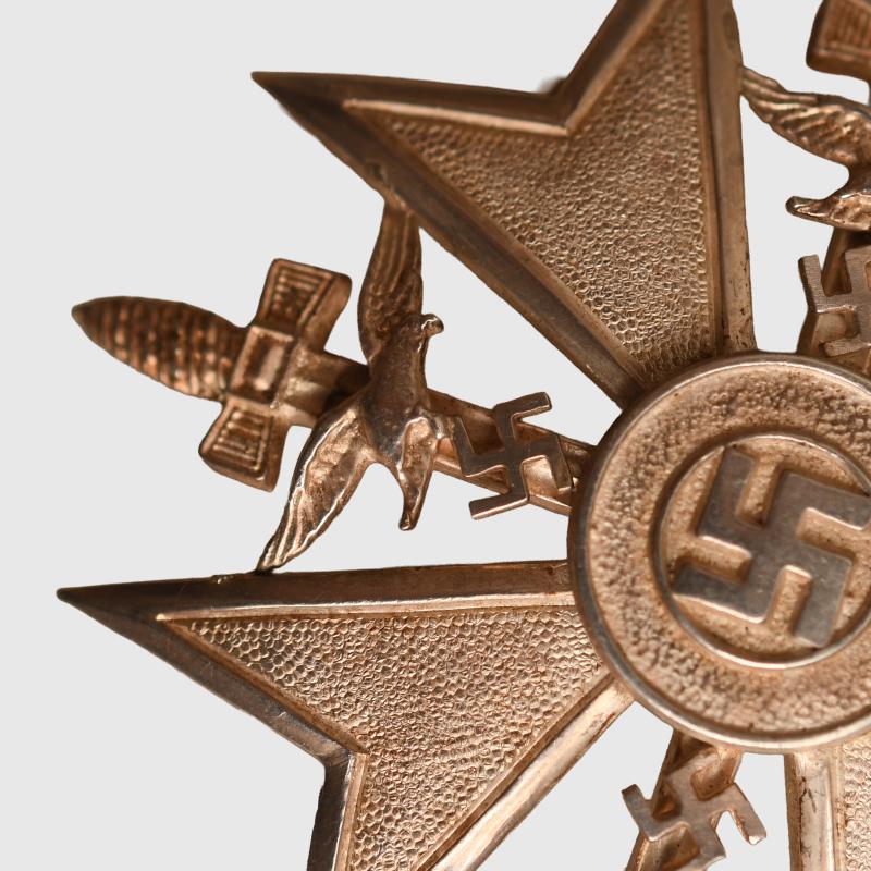 A beautiful example of the Spanish cross in silver with swords, delicately stamp 925, beautifully possibly hand finished sword hilts, very fine pebbling within the arms of the Maltese cross and the circlet around the swastika, a deeply convex shape to the award, cut out arms to the swastikas.