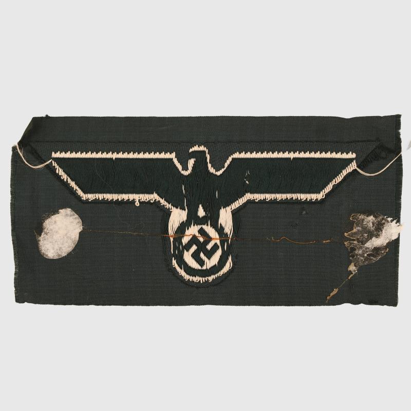 The Bevo woven light grey eagle on a very dark green background, mint unissued cut from roll.