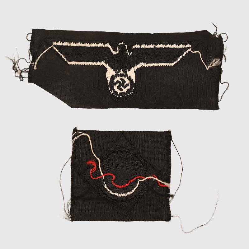 The mint unused cut from roll white eagle on Bevo black background with matching cockade for the army Panzer overseas cap for enlisted men.