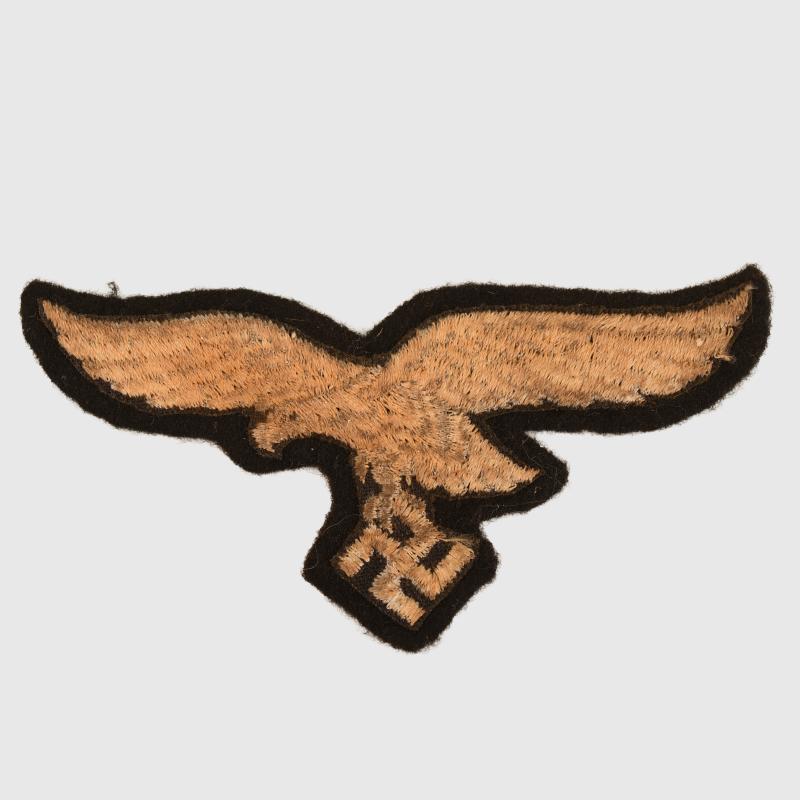 An enlisted man’s version of the machine embroidered grey Luftwaffe Eagle on black backing cloth for fitting to the Luftwaffe Black wrap over tunic.
