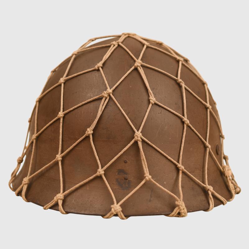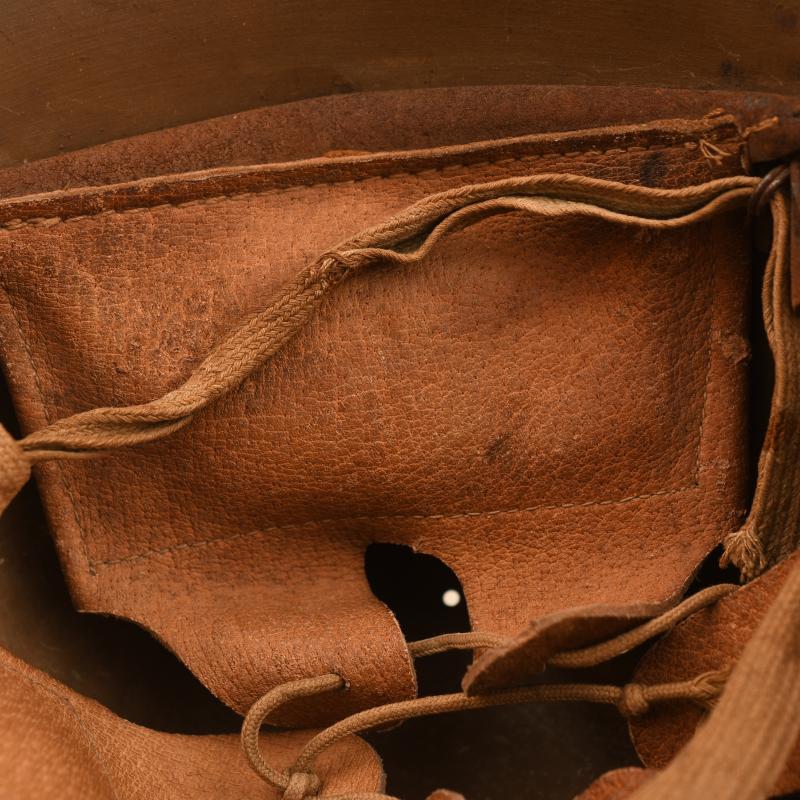 A very good condition outer shell retaining all of its original paint finish, some slight rust bleed to the army star, the lower part of the shell having the quite distinctive hand painted slightly different shade of brown that runs around the full circumference just below the star, with its original net cover, the inner three pad liner system still having very good colour to the leather, with service use more prevalent to the front pad, with its original drawstring, on the reverse side of the front pad Japanese kanji lettering with a large number one and the number 18, the tape liner is complete to the inner part of the shell but the long tapes have been cut, one painted Kangi letter in white to the inner rear of the shell.