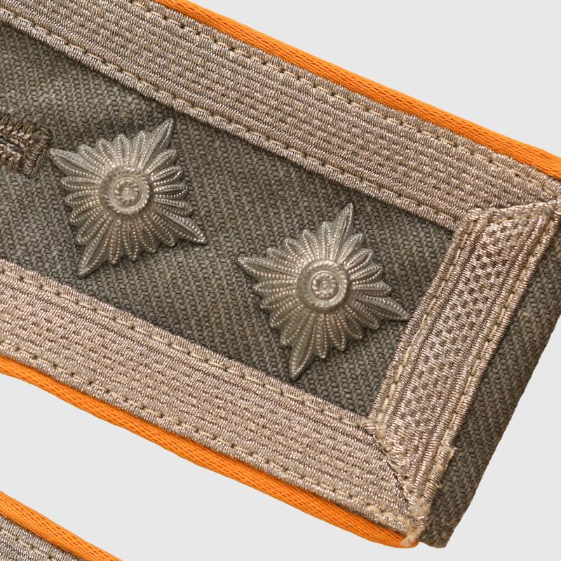 A very rare pair of Luftwaffe NCO shoulder boards, constructed in the blue heavy canvas material to fit the Luftwaffe blue tropical tunic, silk yellow piped, rank tresse and pips for the rank of Oberfeldwebel