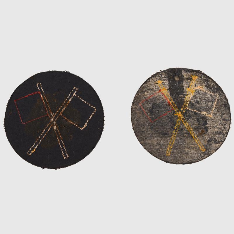 Two Signallers arm patches, both with red and white laid on flags, one onto dark blue uniform cloth that has one moth hole, the other on a lighter blue uniform cloth with one pin hole through the top.
