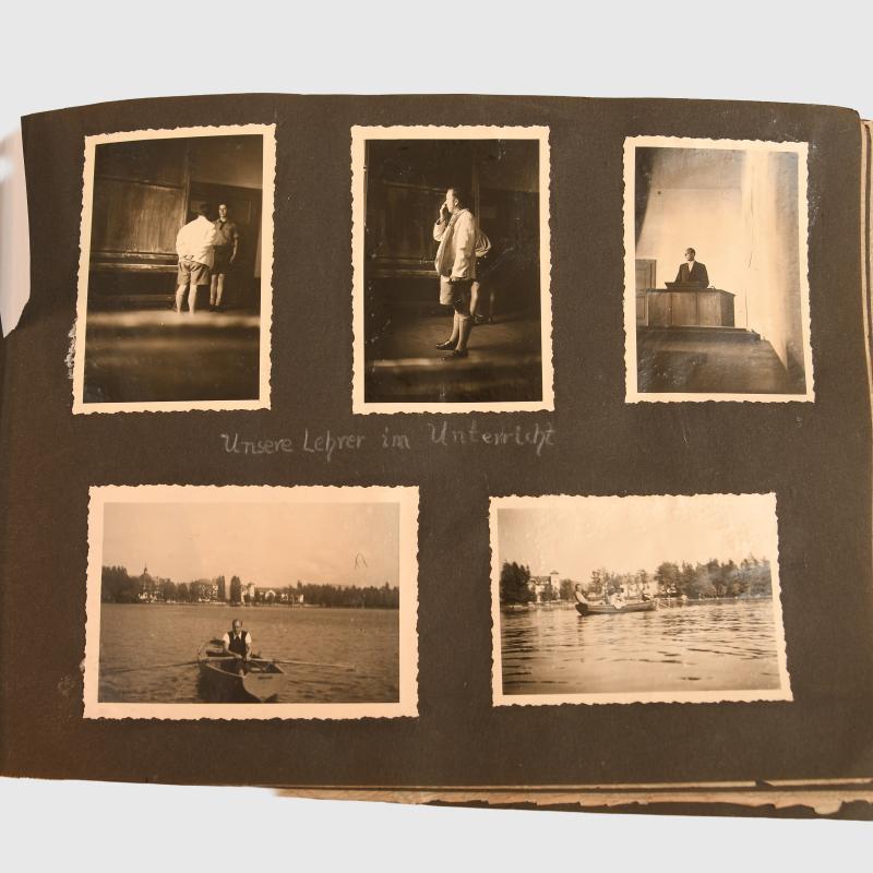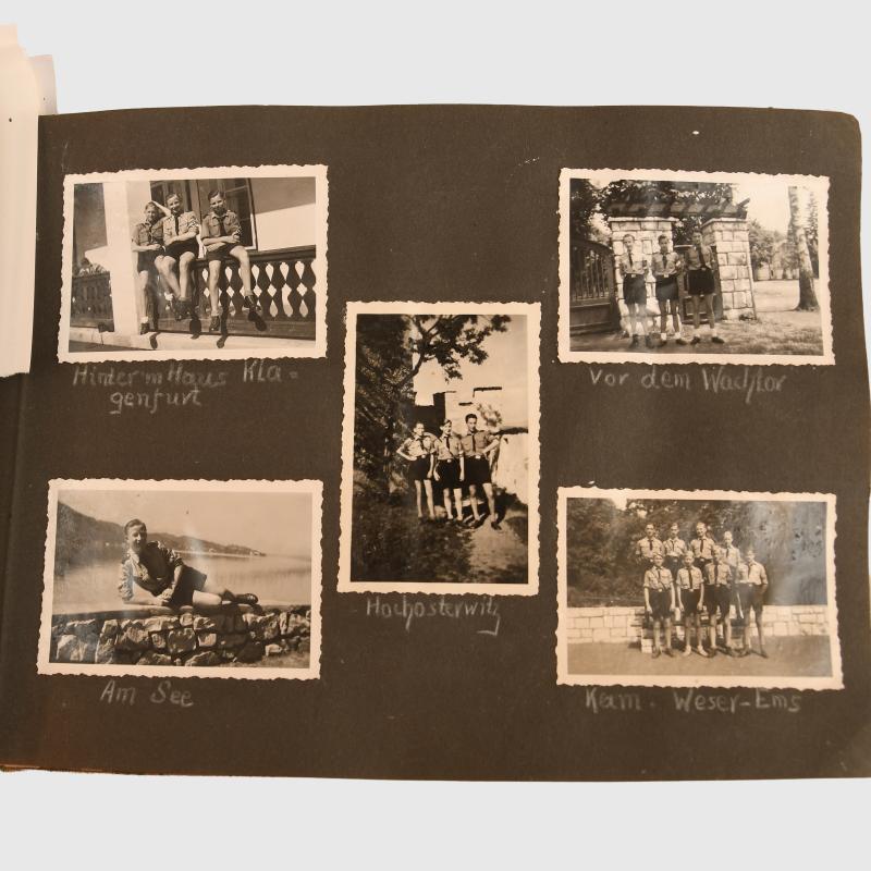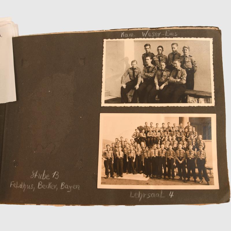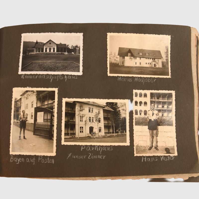 A rare album and superbly researched containing approximately 90 photographs. Standard linen exterior belonging to Trommler (Drummer Bayen) Jhno Joost Constant Bayen, a drummer in the Sudost Karten Hitler Youth. The photographs of HJ groups marching bands in various Austrian town, Klagenfurt and Villach with teachers, HJ leaders, a Gauleiter, Wehrmacht officers in uniforms, a remembrance ceremony, meeting Italian youth leaders at the Oberkrain Railway Station, Reich Minister Funk. Interestingly Bayen wears a DJ buckle, not the HJ buckle that his comrades wear, included are four prisoner of war cards to home from Camp No. 142 in Thol Par Pont-D’Ain in France. The noted Hitler Youth author unfortunately now deceased, Philip Baker who wrote many good works on the Hitler Youth writes to the previous owner of this album in January 1999 thanking him for the loan of the album, he then goes on in his letters to identify each page and what each pages contains. Images number 56, 58 and 80 definitely identifying him wearing the RFS shoulder boards. The following prisoner of war cards are four cards which he writes to his parents in late 44 and early 45 sending them messages that he is OK and look forward to seeing them some time in the future. A magnificent Reich Finance School photograph album, very well researched and expertly presented. More extensive, extra images can be seen on our new Premium website, type in regimentalsmilitaria.co.uk in to your web browser.