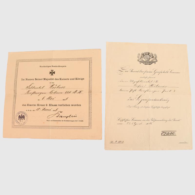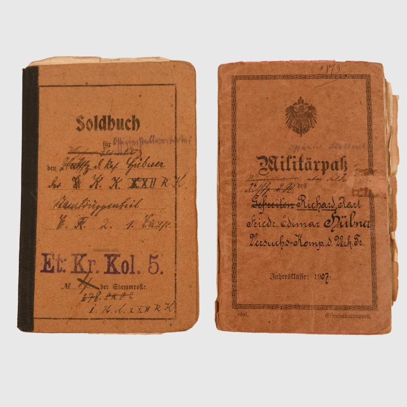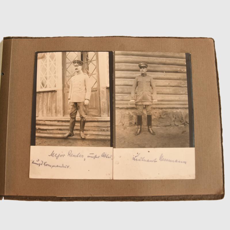 A small album of a German driver both on the Western and Eastern Fronts of WWI. The album contains 47 images, French scenes around the Verdun with German soldiers, observation balloons being used over the battlefield, an interesting shot of Jager Zu Pferde soldiers wearing gas masks, trench scenes, officers identified, a large format picture of what appears to be an Austrian soldier lying dead, a destroyed airship, burning railway stations in Warsaw. At the rear of the album is a mounted Cossack officer dated 1916 plus captured Bulgarian officers with an Austrian officer. Accompanying the album are both the Wehrpass and the soldier of Feldwebel Richard Hubner. It is very difficult to obtain both the Wehrpass and the Soldbuch of the same soldier, especially in WWI. Both books are profusely filled out with many inlaid documents. He was also attached at one stage to the Prussian Flying Station at Cologne. Accompanying the two passes are a huge amount of other documents including citations to the Iron Cross 2nd class, the Bulgarian WWI Service Award, which was awarded in 1939, a Third Reich awarded 1914 War Honour Cross, a certificate for an award from the City of Bremen plus other related military documents from the period. Also wedding photographs of Hubner dated ‘30th March 1918’ in full military uniform with his wife. An interesting and identified documentation and album group.