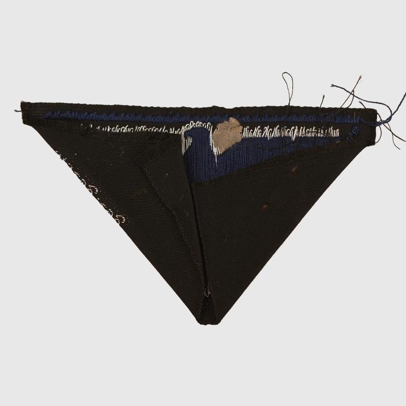 Beautifully Bevo woven in silver wire on navy blue background, already folded into its triangular form for fitting to the overseas cap. Bevo woven Ges Gesch to the material on the reverse side.