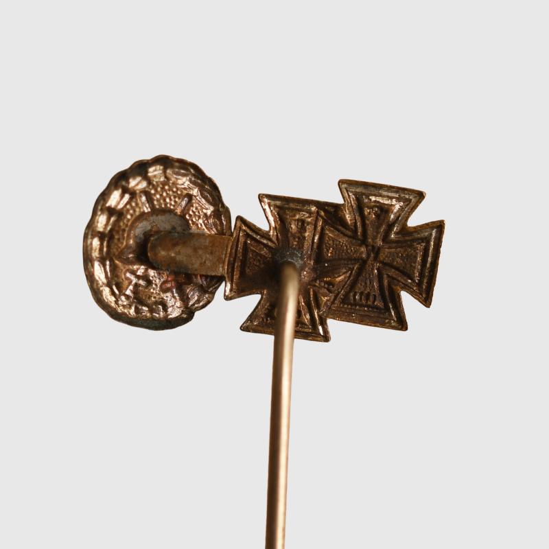 The two Iron Crosses and the Wound Badge in black fitted together on its twisted and grooved lapel pin fixing measuring 20 x 6mm.
