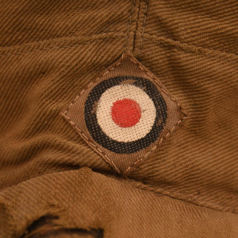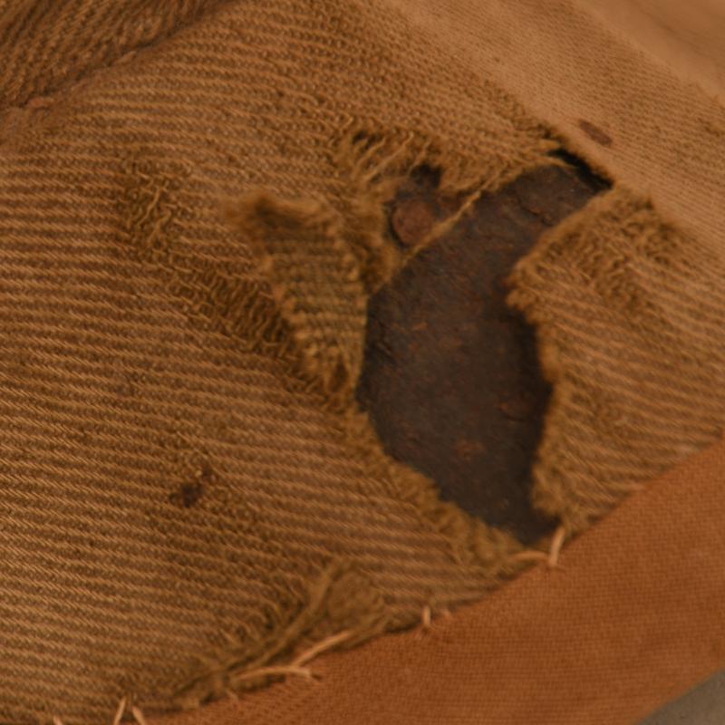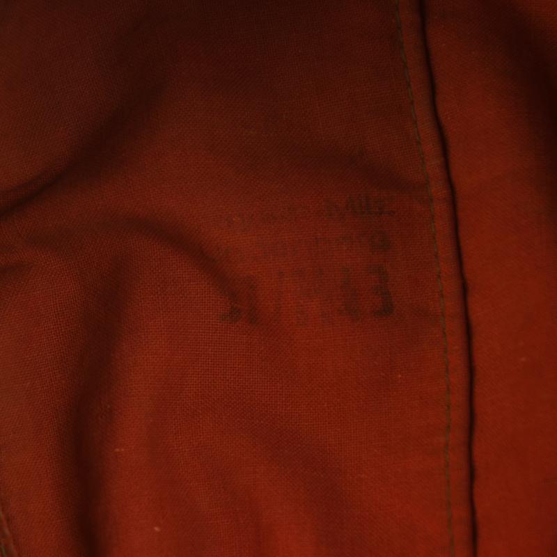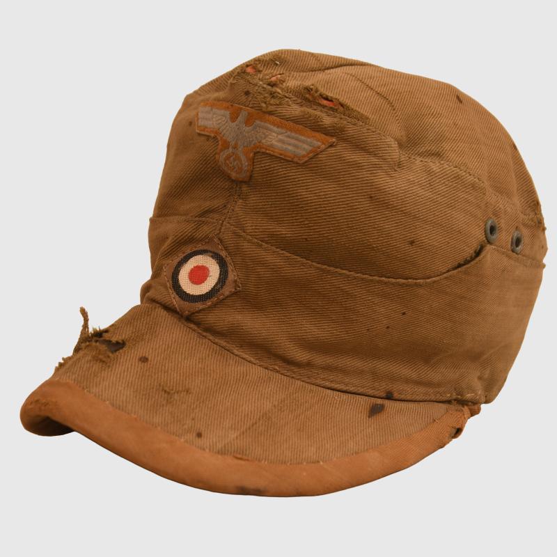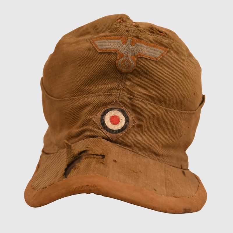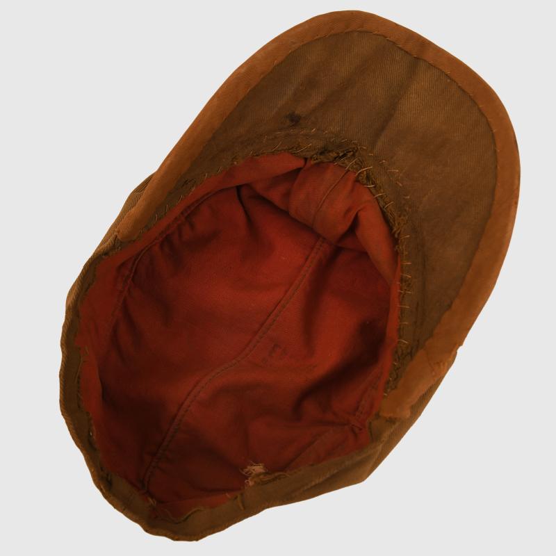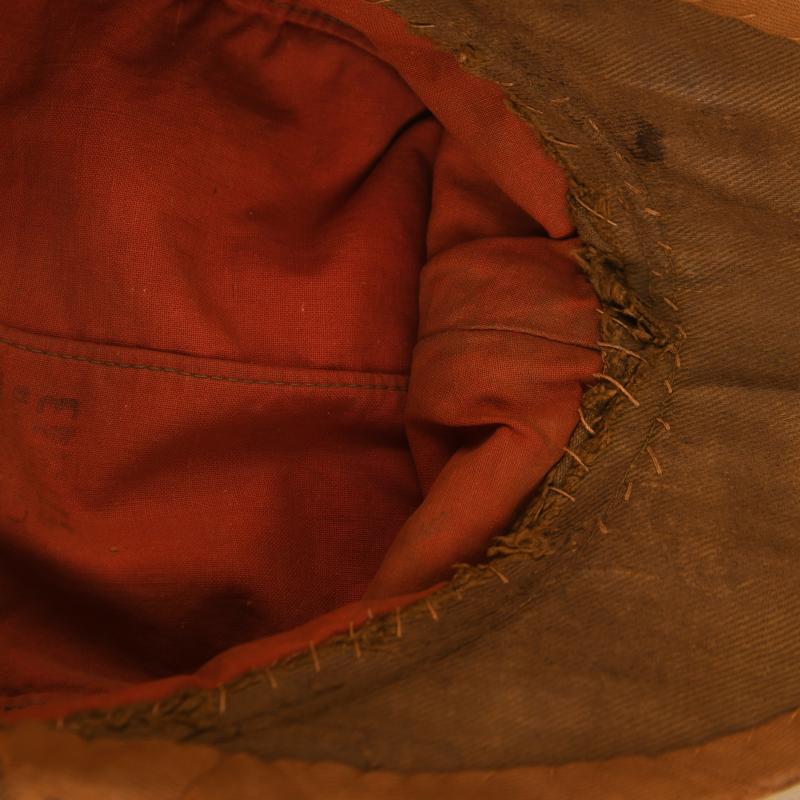 A well worn and field repaired 2nd pattern tropical field cap issued in 1943, with the addition of a sweatband. On this example the sweatband has been removed by the wearer. There are various nicks and stress related parts to the cap that has shredded the material in places with a view of the red cloth lining below, especially in the area of just above the originally applied tan and blue Bevo woven cap eagle. Tropical field cockade all in place. Twin zinc side air vents. The front peak of the cap has obviously shred badly through wear and has been strengthened with the addition of a piece of tropical cloth by the original wearer. Approximately size 56. Some of the issue stampings are visible but cannot be deciphered.