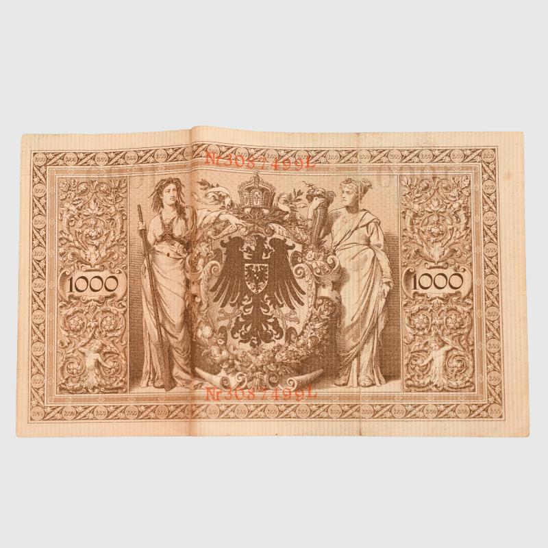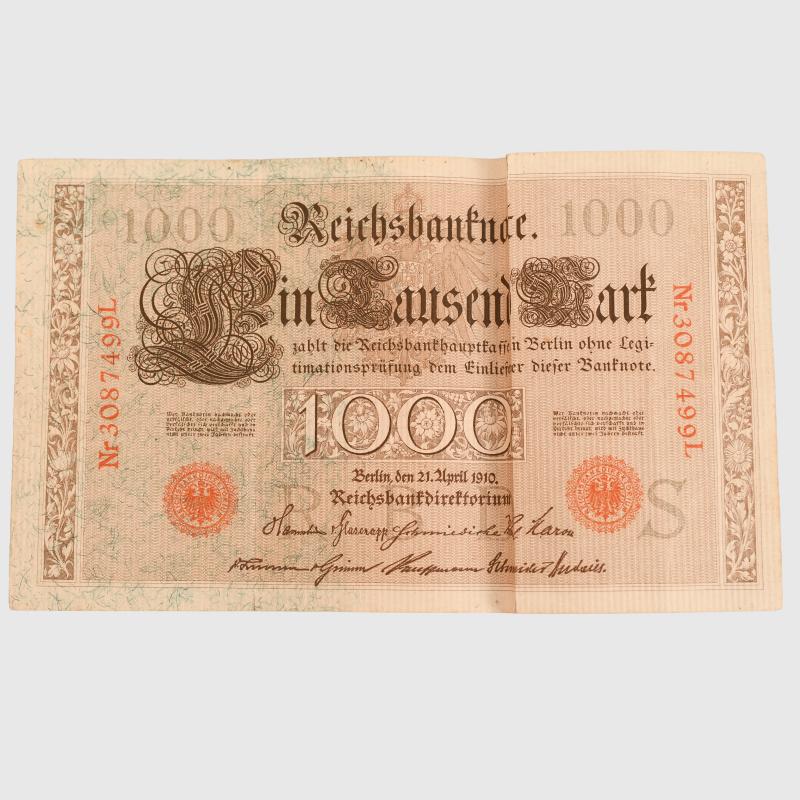 A 1000 Reich Mark banknote dated April 1910, A 20 Mark banknote dated February 1918, both with faults and tears.