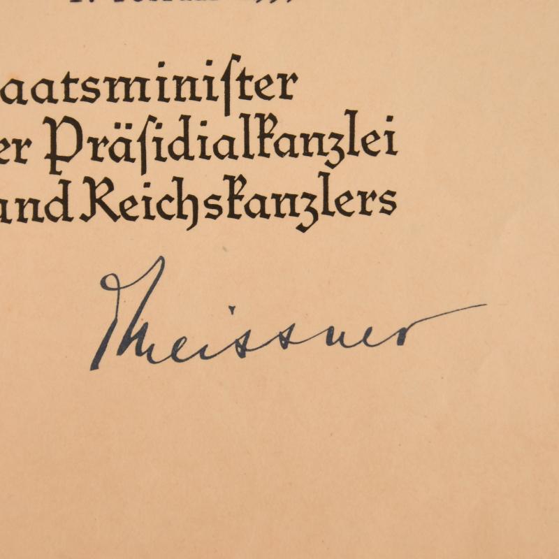 An impressive large A4 size pre printed citation, double punch holed, non folded, to Hauptwachtmeister Josef Stephan, awarding him on the 1st February 1939 the Police Long Service Medal for 18 years. State Secretary Meissner facsimile signature with eagle and swastika embossed lower left side of the citation.