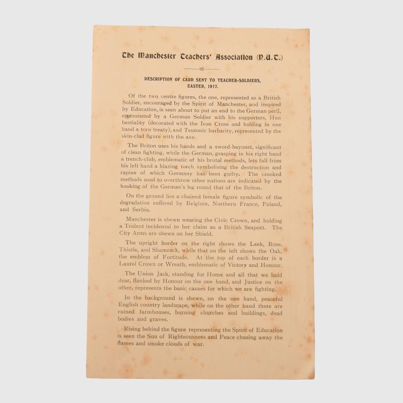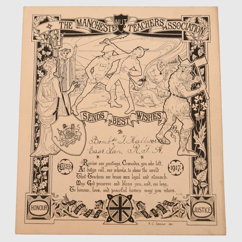 An exceptional small grouping of documents that in themselves are extremely poignant, they are a certificate of best wishes for a Bombardier J. Halworth East Lancs Royal Field Artillery, a beautiful illuminated document awarded from the Manchester Teachers Association of the National Union of Teachers. The document itself is excellent and in very good order with no rips or tears with a beautifully inked name inscription. The picture itself again is poignant and shows typical Great War propaganda type images, interestingly these images are explained within the letter, which reads ‘Description of card sent to teacher soldiers Easter 1917’, again the reading is very much of the time. There is a National Union of Teachers letter from Brooks Bar Manchester to the soldier, he is addressed as ‘Dear Friend and Colleague’ again dated ‘1917’. There is a very interesting scholars souvenir No.2. sheet of paper, this presumably would be coloured in and cut out by school pupils showing typical patriotic images throughout. There is a coloured postcard of Lord Kitchener from the period and much research has been carried out upon this super grouping. Like to many others Thomas Halworth was a casualty and died on the 28th March 1918 aged 29, he served C Battery 211 Brigade RFA. There is a Commonwealth Graves Commission memorial paper with a photo showing the gravestones. There is research for more than a name showing again details of Bombardier Halworth. Good clear photocopies of the censors of England and Wales. Various Photostats of documents relating to his death and a good copy from the medals roll document listing Halworth. A super talking point and a great centre point to a First World War document collection.