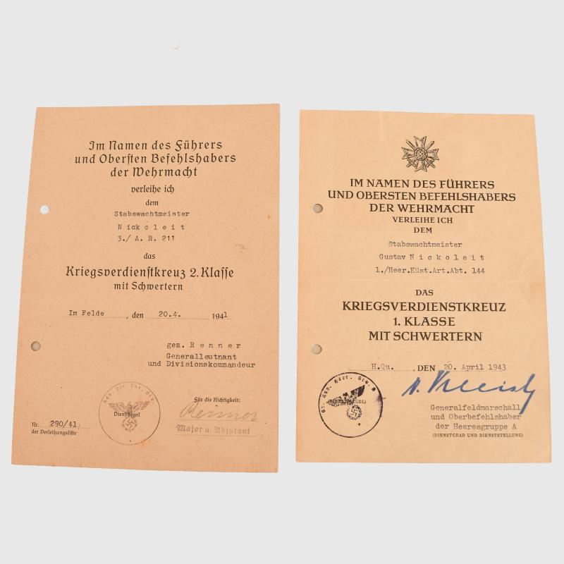 A good group to a member of the Army Coastal Artillery unit. Th Krim Shield citation is field typed on A5 size paper, folded twice, punch holed for filing, awarded to Stabswachtmeister Gustav Nickoleit of Army Coast Arteillery Abteilung 144, awarded 30th January 1943 with a facsimile signature of General Field Marshall Von Manstein. War Service Cross 2nd class with sword citation, standard A5 size, good quality paper, folded once, punch holed for filing, with a facsimile signature of General Field Marshall Ewald Von Kleist, dated 20th April 1943. War Service Cross 2nd class with swords citation, thick quality A5 size paper, punch holed for filing, non folded, awarded 20th April 1941 with unit stamp and signature of Major and Adjutant. This unit was based in the Crimea and was later part of the south Ukraine Army group, destroyed August 1944.
