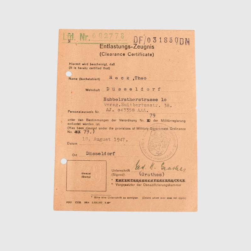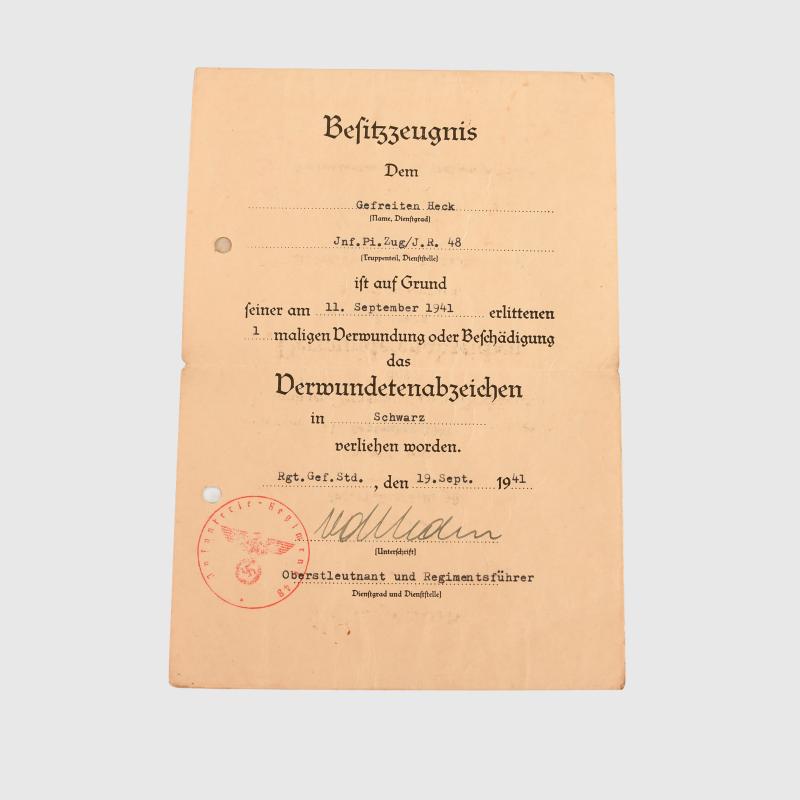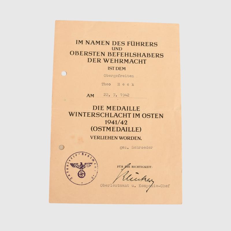A good group of three citations comprising the Black Wound Badge, East Front Medal and the Demjansk Shield to Gefreiter Theo Heck. Winter Medal in the East, awarded 22nd July 1942, A5 size, punch holed. Wound Badge in Black, A5 size, standard issue citation awarded 19th September 1941, punch holed. A5 heavy card citation awarded 31st December 1943, also punch holed, one stain to the Denjansk Shield. Facsimile signature to the Denjansk Shield of the General of the Division, other two citations pen signed by Company Commanders, complete with a 1947 certificate of clearance, issued by Allied Military Government in 1947 in Dusseldorf. The 12th Infantry Division fought in Poland 1939, France 1940 and was one of the Divisions deceased in Denjansk March 1942 and in 1944 was the 12th Volks Grenadier Division and took part in the battle of the Hurtgenwald Forest and the Ardennes campaign.