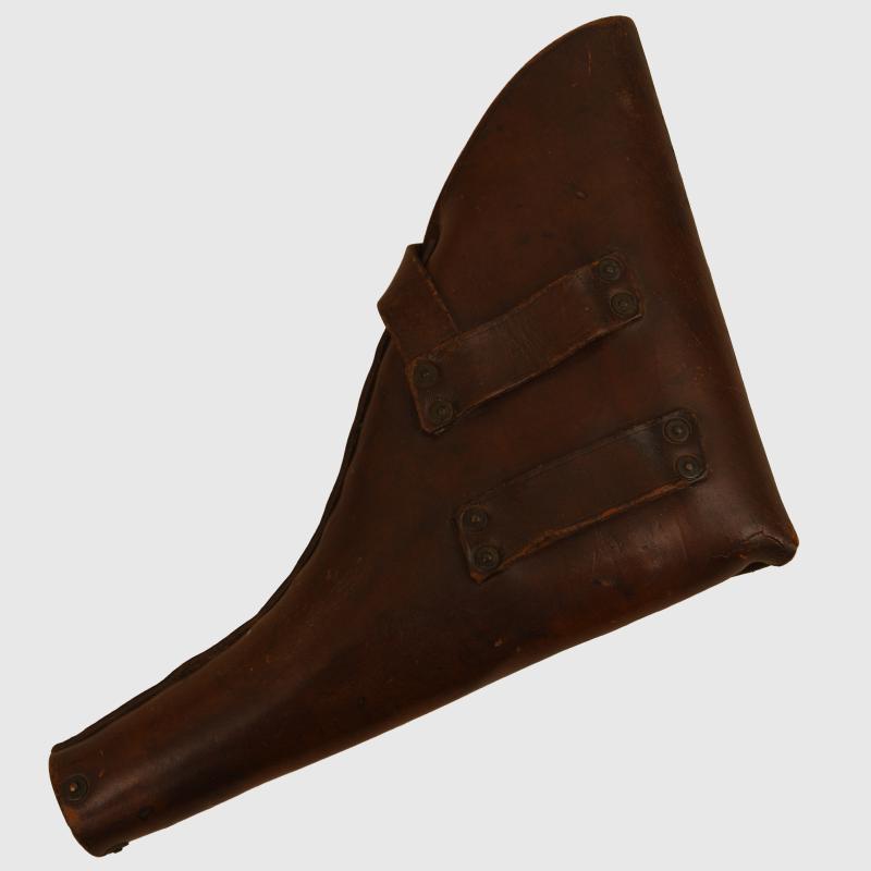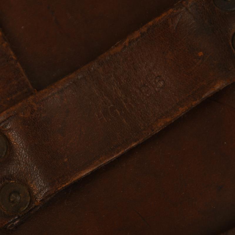 A very nice condition hard but supple leather brown holster for the Webley Mark 6 revolver, marked ‘HGR 1916’ on one of the belt loops. The holster is constructed in the naval rivetted fashion with two separate numbers stamped inside the flap of ‘664’, which has been partially erased and ‘735’ indicating that this may have been an issue holster.