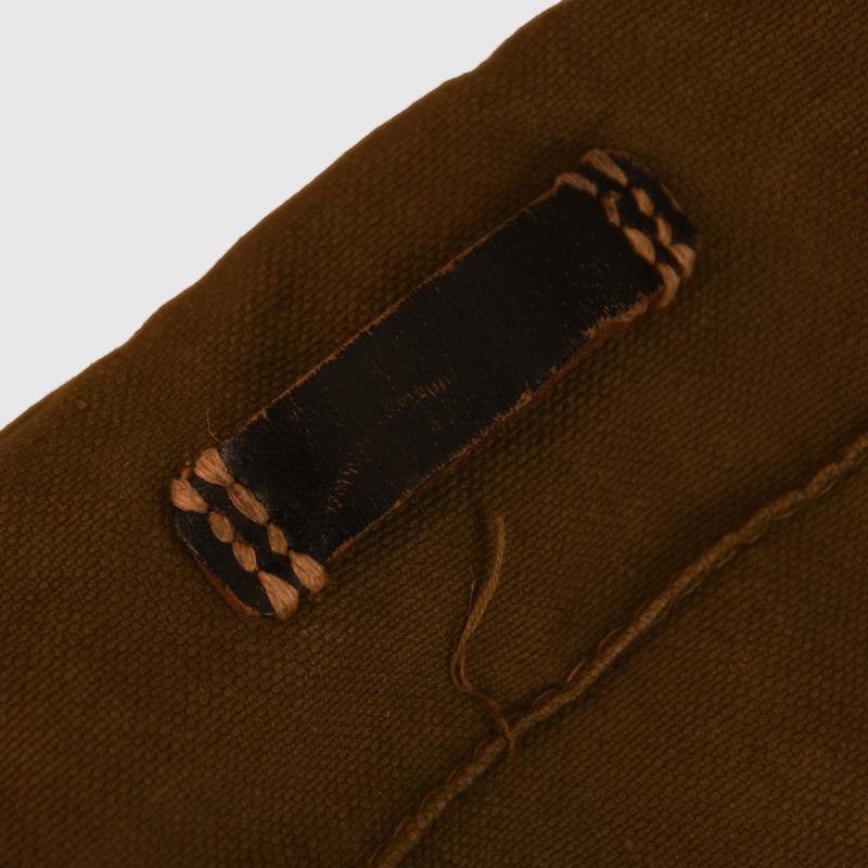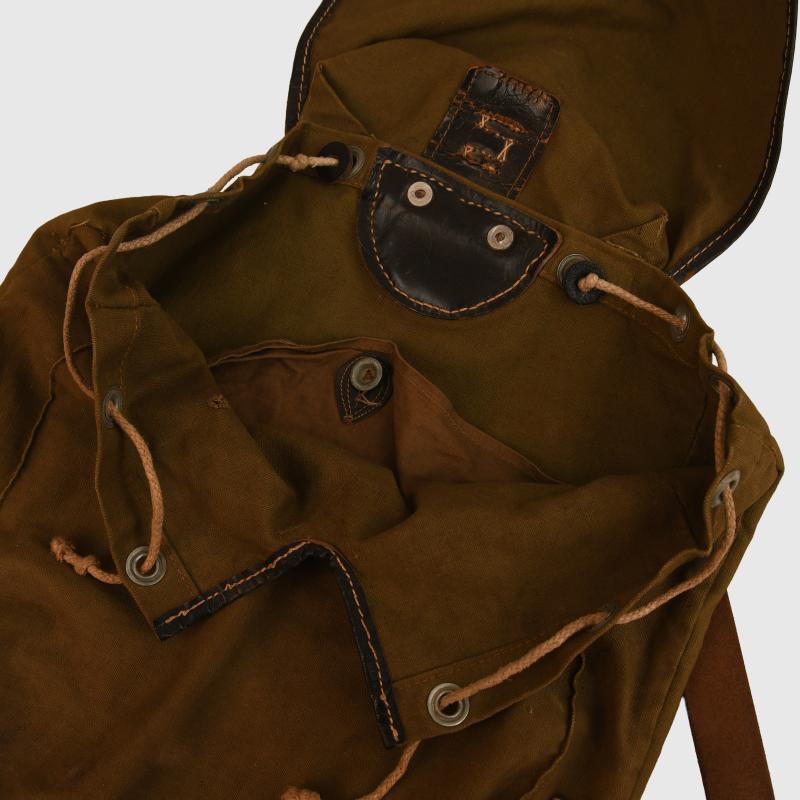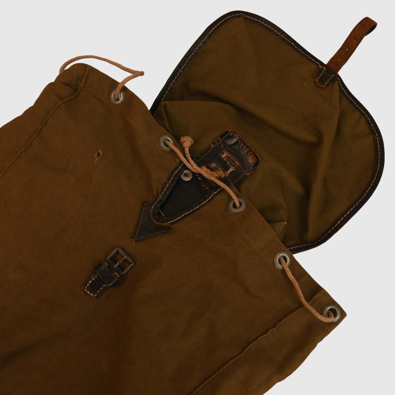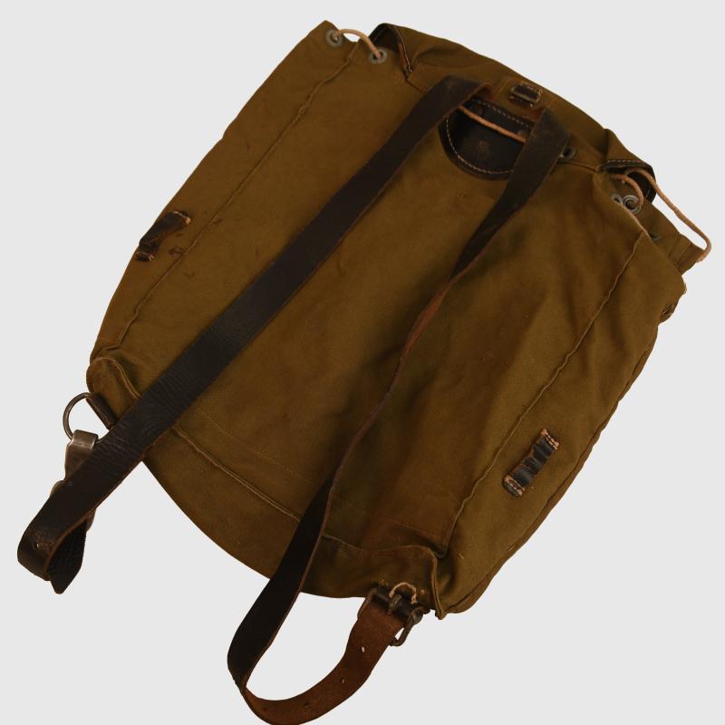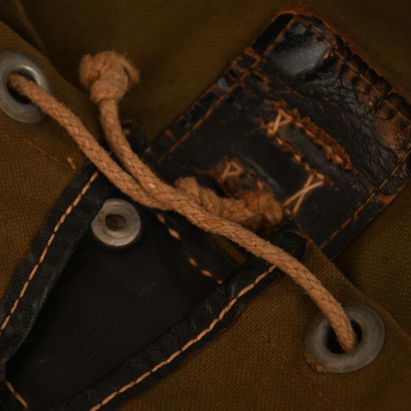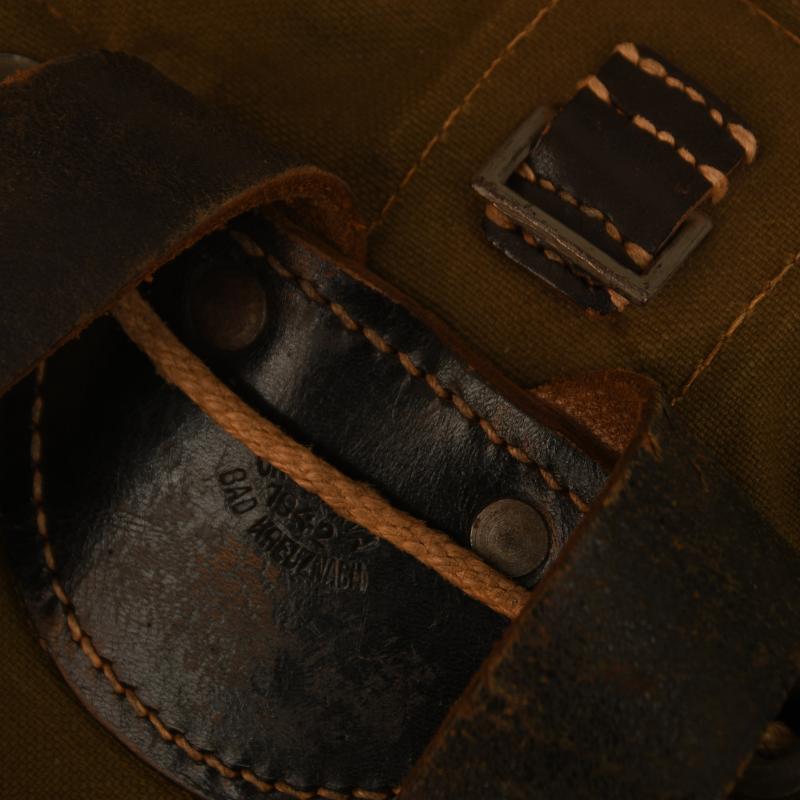 The small version of the back haversack in olive canvas with all black leather fittings, good white stitching. Both shoulder straps complete. Maker marked on the reverse side ‘Carl Ackva 1942 Bad Kreuznach’. Complete with its original string aperture closure.