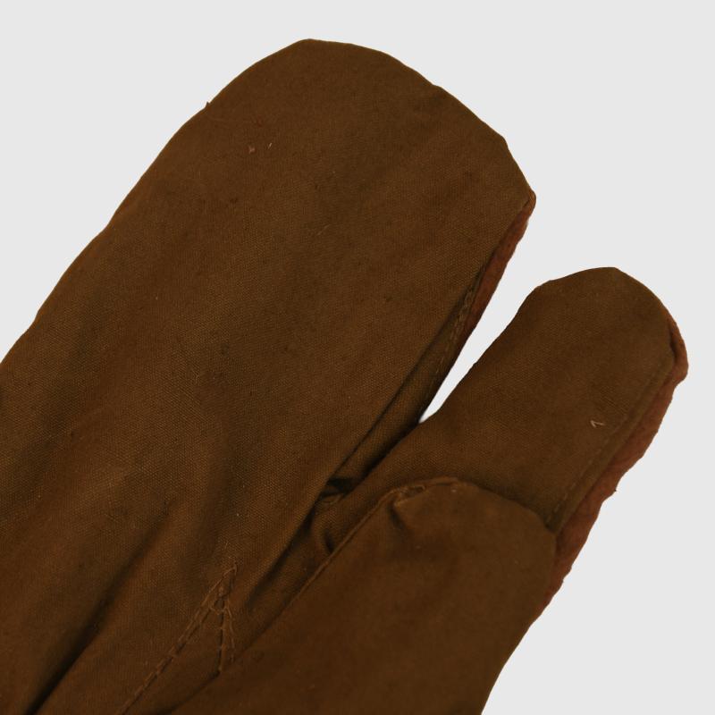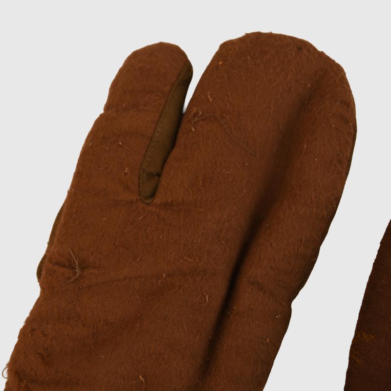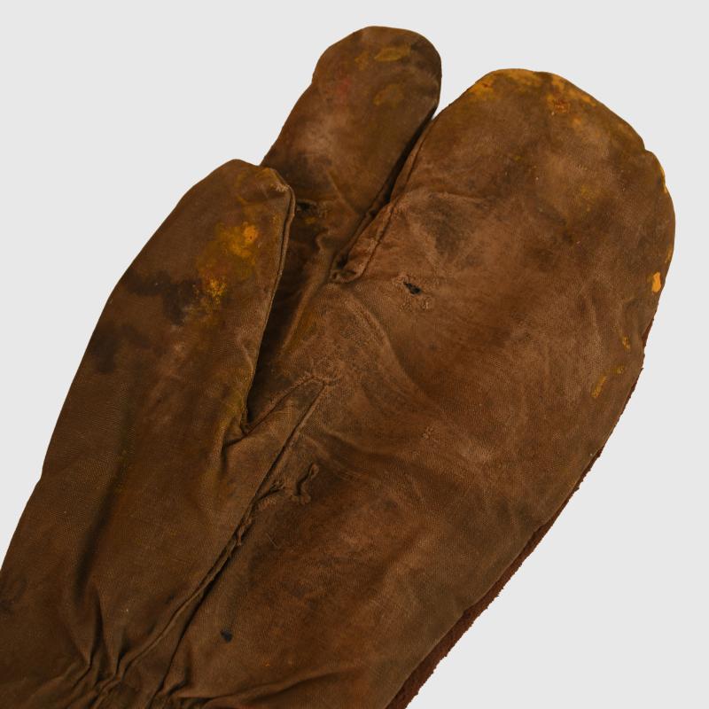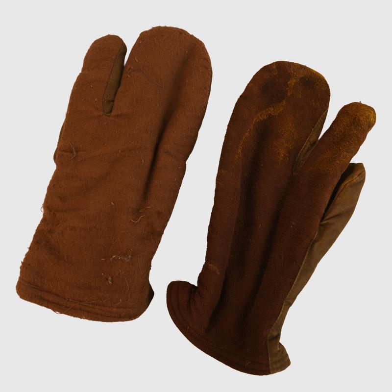 A mismatched pair of Russian winter mittens, one glove with far more wear than the other, blanket lined.