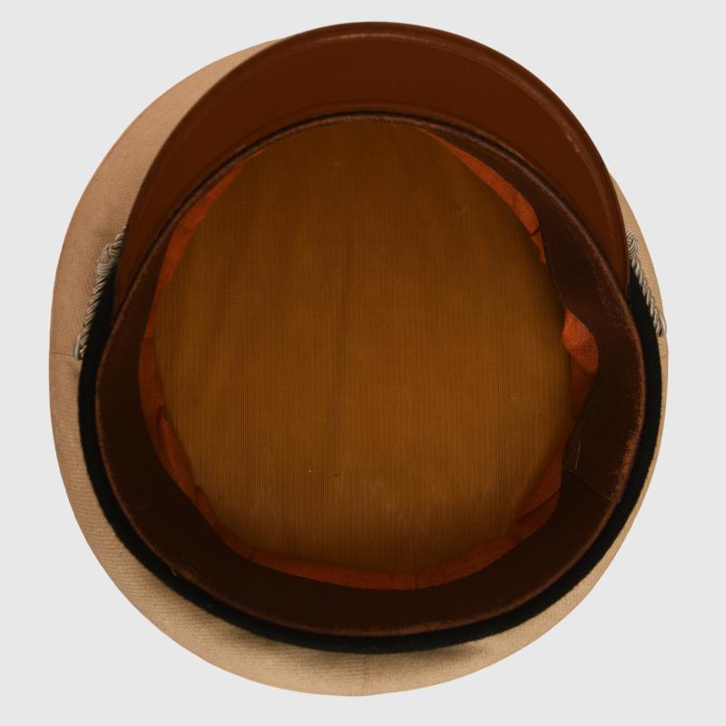 A fabulously rare cap from the 1936 Berlin Olympics. Standard high saddle shape, the form of the cap from the side view is very similar to the construction and shape of the diplomatic officials caps. Large size, although non size stamped, possibly size 57 or 58. Fully fixed white top that the crown has toned with age, some very light foxing to the white heavily grained thick material. White piping to the crown. The centre band is all in black with no upper or lower differential piping. Very delicate rope style silver cap cords with two side buttons. The eagle fitted is the left hand side looking political eagle in white metal, below is a very attractive Olympic ring badge with the exterior ring matching the political style eagle. All of the enamel rings are undamaged. To the interior a grained leather sweatband, which does have minor evidence of wear use. We must remember that these hats would have only been worn during the 3 week period of the Olympic Games. The upper inner crown lining is a very similar texture to the waterproof crown lining of SS caps in a slightly lighter shade with the side lining in the classic russet brown brushed cotton very similar to that used on the army and SS caps of that mid to late 30’s period. A superb visor cap, on page 118 of the excellent double volume work "Sport in The Third Reich" a photo of a White Top cap worn by an official of the Italian delegation, with the text below stating that every country had a specially designed hat for formal occasions during the games. More extensive, extra images can be seen on our new Premium website, type in regimentalsmilitaria.co.uk in to your web browser.
