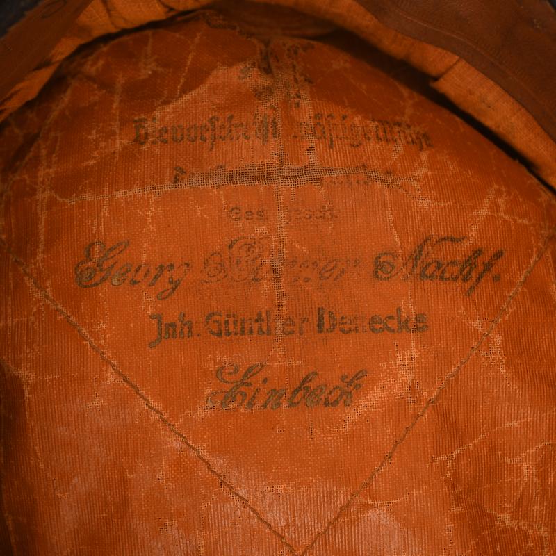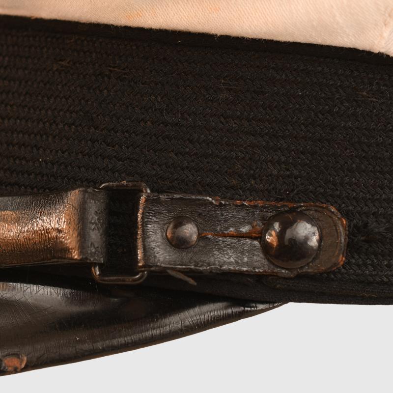 A scarce cap from WWII being a very large size, possibly 62, white top cap from the Luftwaffe Sea Rescue Service. The white top has toned and is fixed directly to the main body of the hat. To the upper part of the mohair centre band is a row of black piping, fitted to the mohair centre band is the very attractive set of wings with anchors below the swastika all in gilt. Standard fibre peak. Standard style of chinstrap with square edge buckles. Black side buttons. To the interior the sweatband showing considerable wear use, all intact, with the initials of what appears to be two previous owners, one hand applied, one with punch holes. The complete interior lining is of the waterproof russet brown style of material. The central lozenge is missing but virtually all of the, what was once, gold blocked lettering for the retailer is intact. The Air Sea Rescue Service was known as the Seefliegerhorstflugsicherung. An excellent explanation and photograph of these caps being worn are shown on pages 336, 337 and 338 of Headgear of Hitler’s Germany by Jill Halcomb and Wilhelm P.E.R.Saris Volume 1. More extensive, extra images can be seen on our new Premium website, type in regimentalsmilitaria.co.uk in to your web browser.