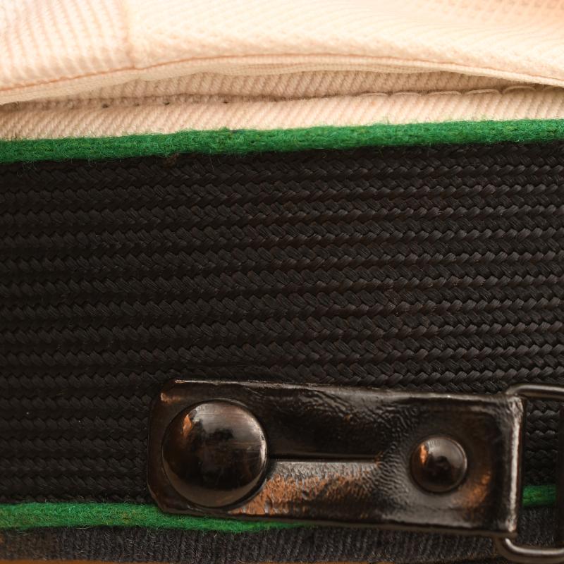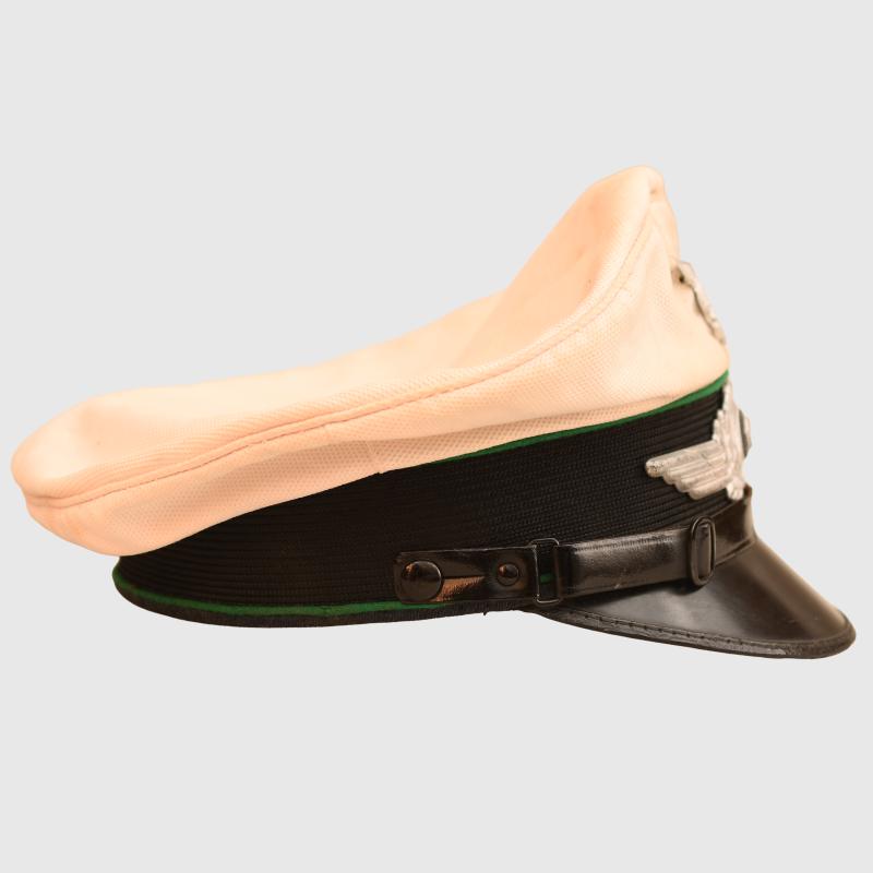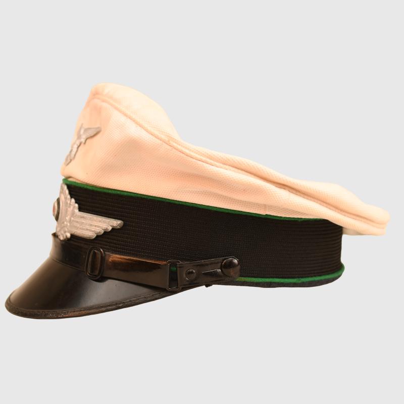 Along with the Light Green piping cap of the Air Traffic Control cap of the Luftwaffe this Jager Green piped cap is the most difficult of all the coloured piping’s for the Luftwaffe to obtain with the waffenfarbe being in Jager green (Jagengrun). A large size cap, non size stamped but possibly 59 or 60. White removable top, the top does have some rust staining. The insignia fitted is the early droop tailed short wing eagle with national cockade. Jager green piping to the upper and lower sections of the mohair centre band. Standard NCO enlisted mans strap with oval buckles. The fibre peak has the double ribbed edge most favoured on Luftwaffe caps. The hat has a narrower than unusual brown leather sweatband, The cap cover is fully lined to the interior with its inner satin lining with a totally undamaged centre celluloid lozenge, marked ‘Original Schellenberg Stirndruckfrei Sonderklasse’. An especially rare cap and even more so with the white removable top. More extensive, extra images can be seen on our new Premium website, type in regimentalsmilitaria.co.uk in to your web browser.