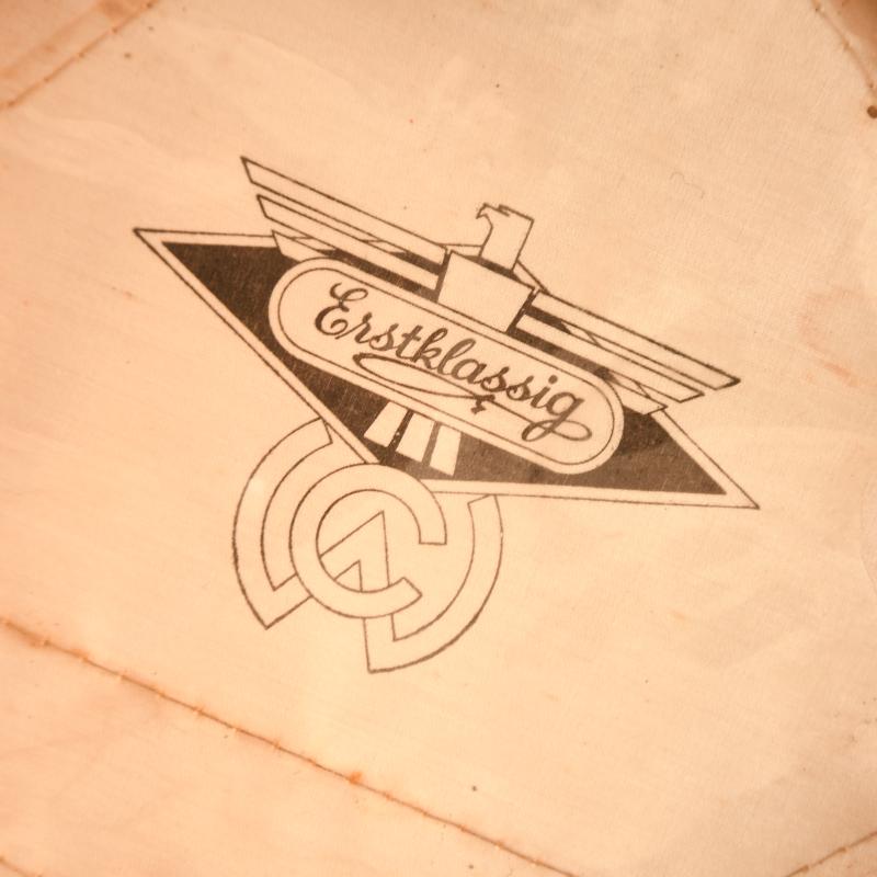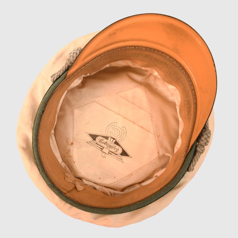 A highly unusual cap from the Third Reich being the Customs officials visor cap with it removable white top. The top itself has toned in colour after years of storage. Standard customs green centre band. Customs unique style stamped aluminium eagle with out-swept tips to the wings. Customs style silver bullion woven central cockade. Standard officers cap cords with silver pebbled side buttons. Although not size stamped the cap is of large proportions, possibly size 60 or 61. To the interior wide light tan leather sweatband shows some wear use. The interior of the cap is fully lined in light tan satin with a totally unbroken centre celluloid lozenge with the maker’s logo of the well known hat maker ‘Clemens Wagner’ below the centre celluloid lozenge. One moth nip only to the green cloth at the very base of the cap otherwise totally free of any moth damage or imperfections. The interior orange forehead cushion has solidified. More extensive, extra images can be seen on our new Premium website, type in regimentalsmilitaria.co.uk in to your web browser.