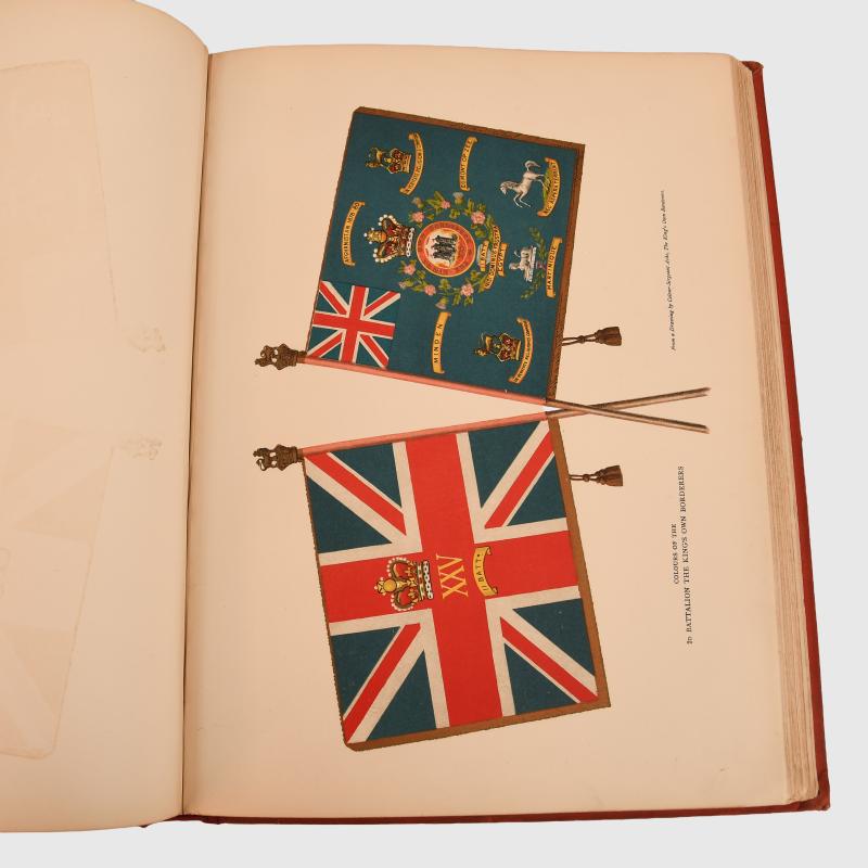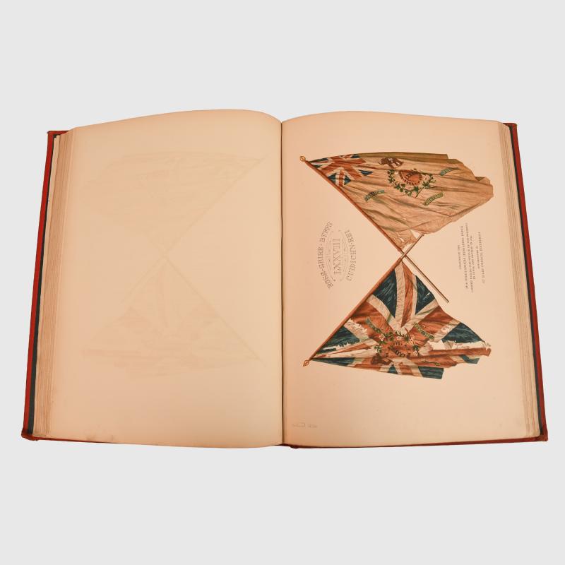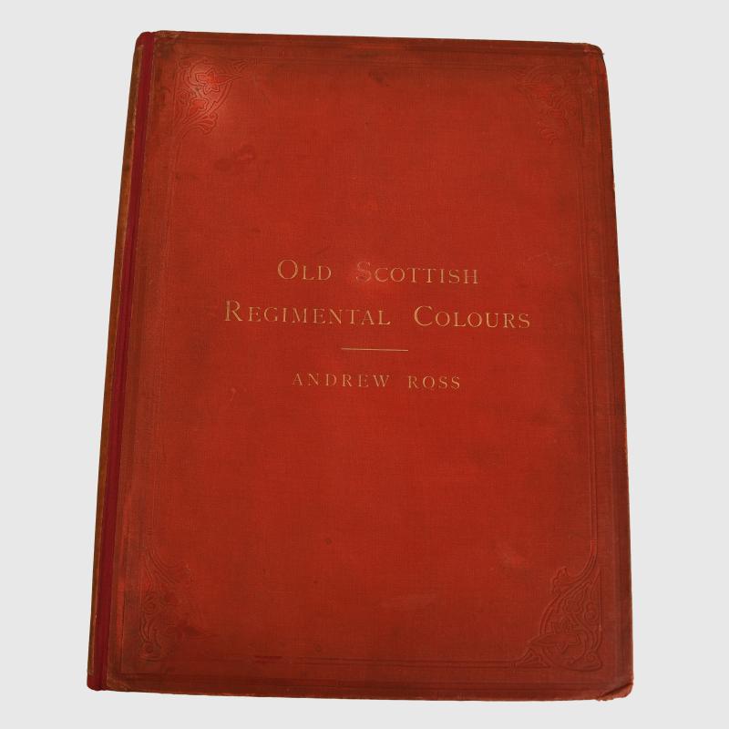 A very nice work published in 1885 individually numbered 100, unfortunately we are not aware of how many were printed of this fascinating large format hard bound work measuring 29 x 39cm, which contains 150 pages of text and line drawings relating to the regimental colours of Scottish regiments. 28 plates all in hand applied colour. Each regiment has its history included with the flags in full colour. There are quite a few pencil annotations throughout the book. Gilt printed to the outer cover ‘OLD SCOTTISH REGIMENTALS COLOURS BY ANDREW ROSS’. Overall condition of the book excellent with slight fading to the edges of the front cover.